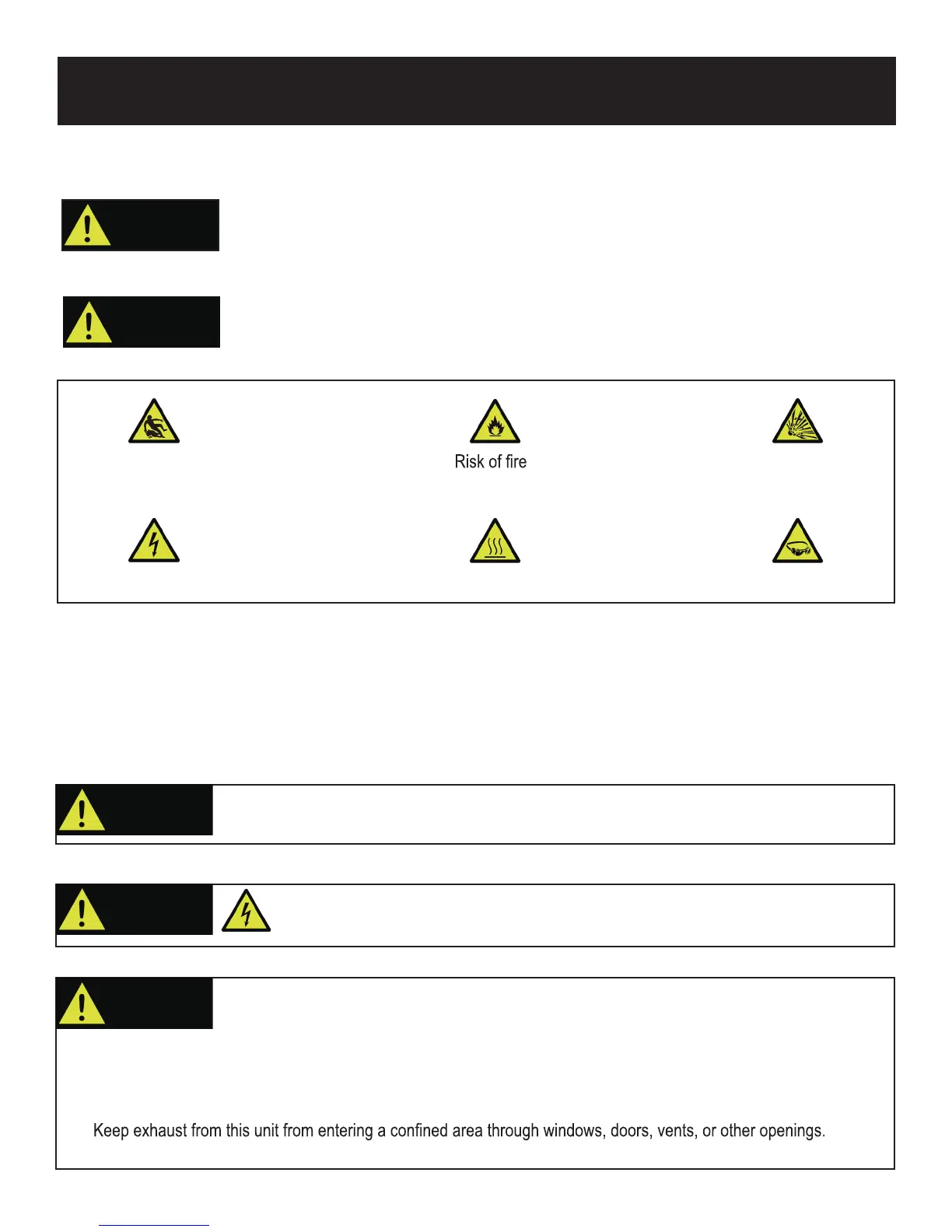 Do not operate indoors or in a confined space preventing dangerous carbon monoxide gas