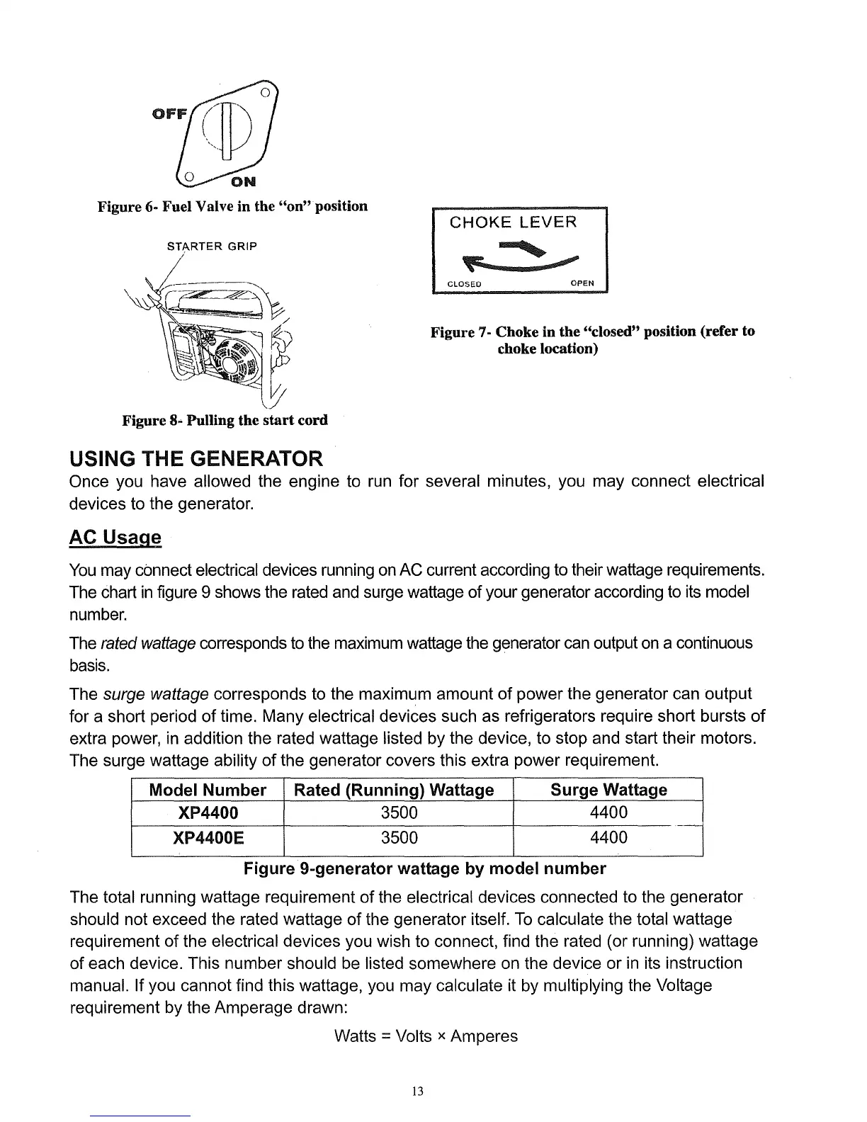 figure 9 shows the rated and surge wattage of your generator according to its model