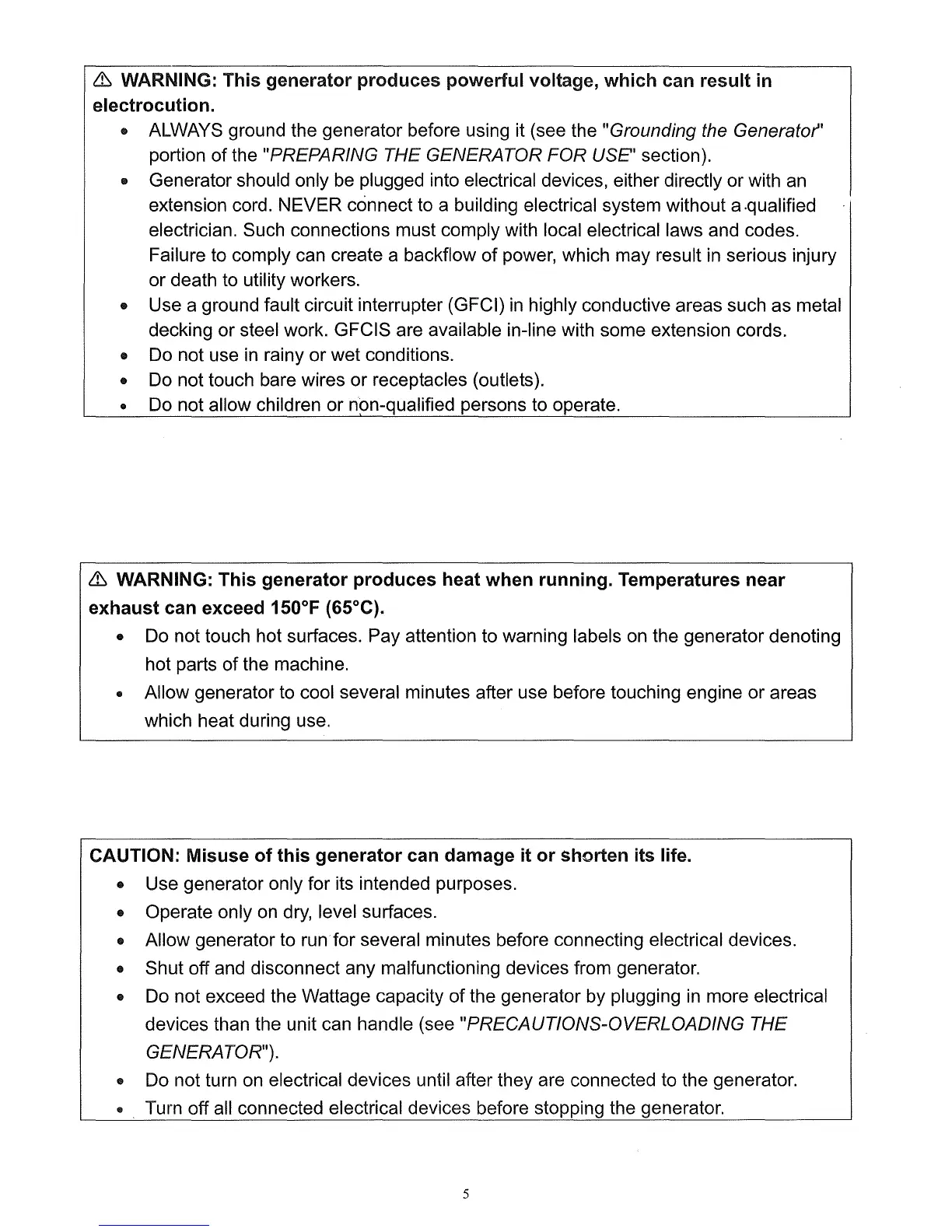 • Do not touch hot surfaces. Pay attention to warning labels on the generator denoting