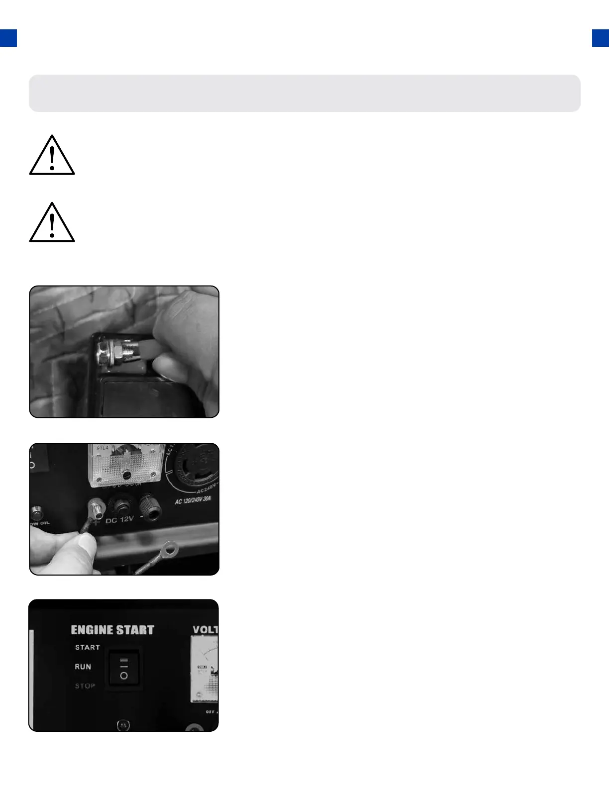 CAUTION: Never try to jump start a car with your generator.