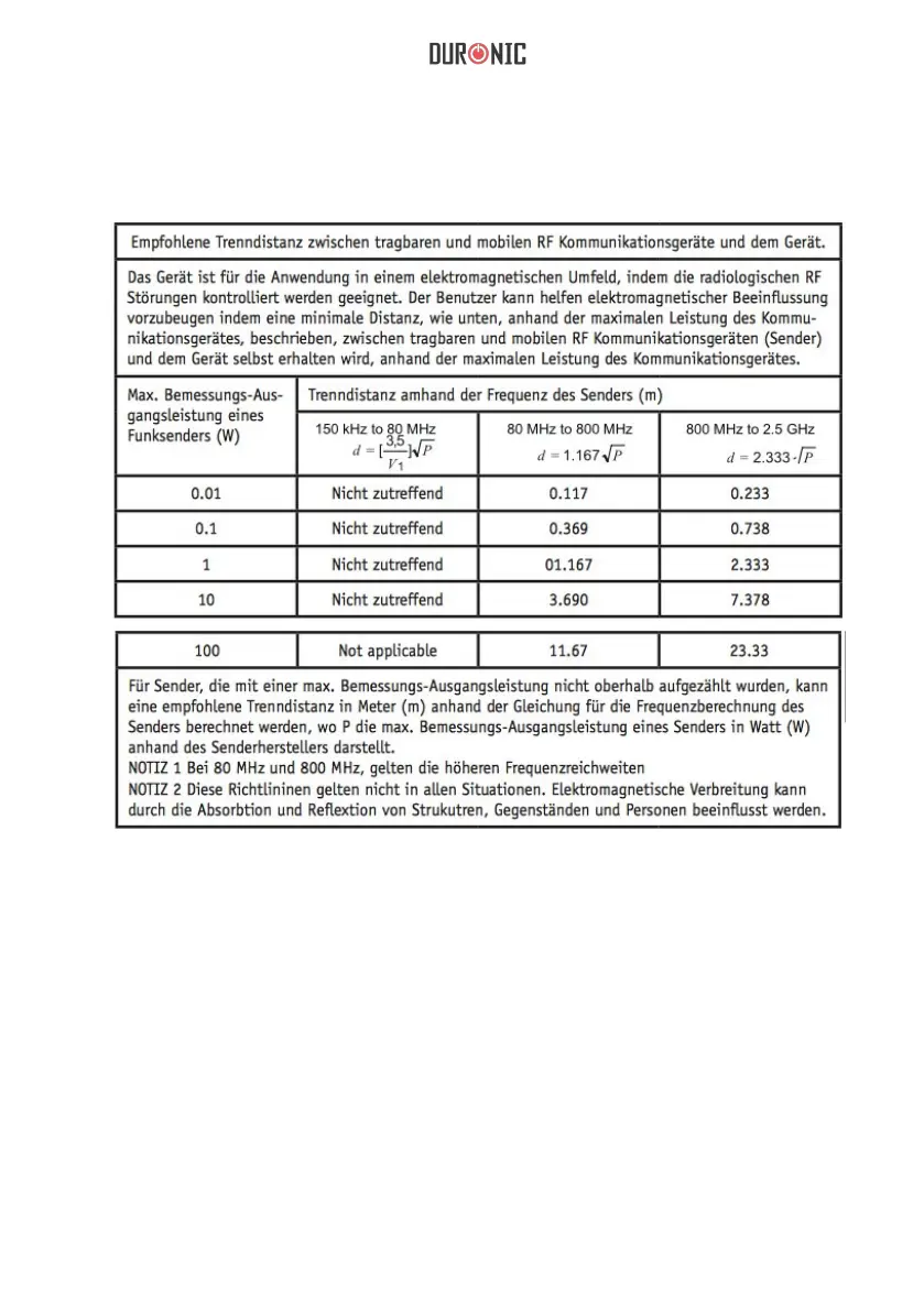Tabelle 6 Empfohlene Trenndistanz zwischen tragbaren und mobilen RF Kom-