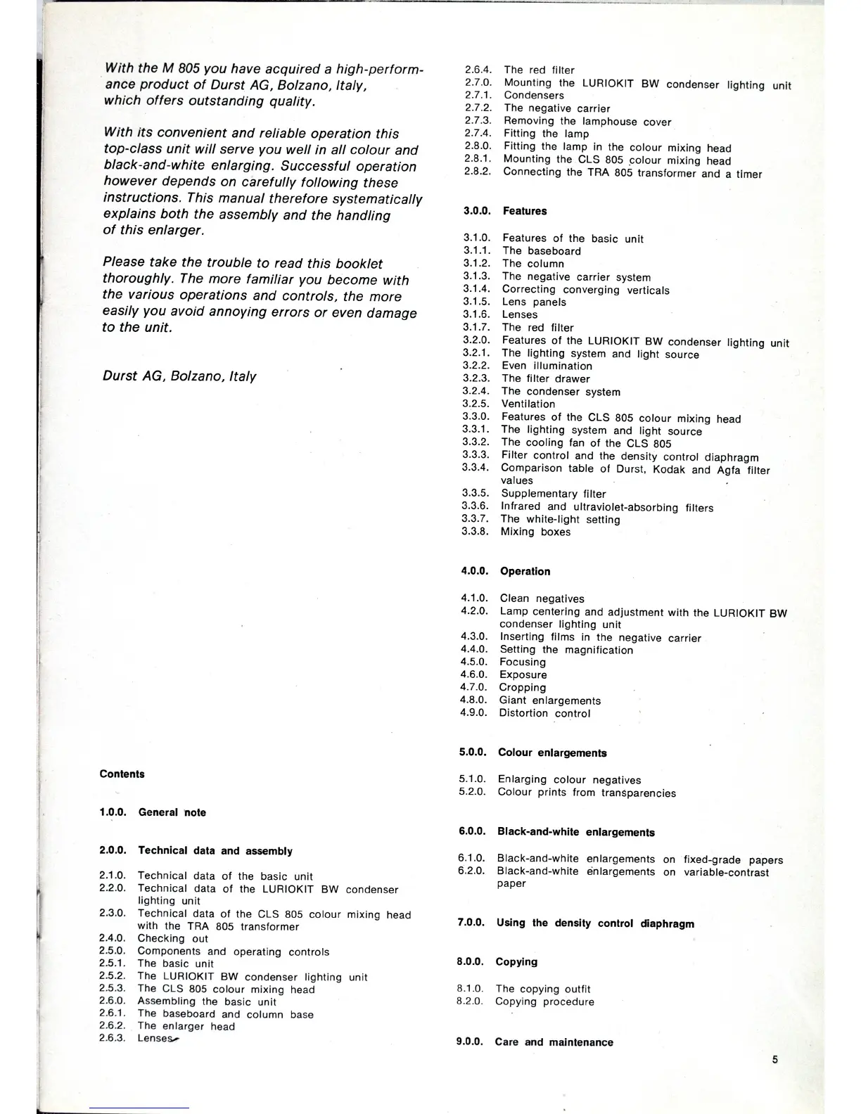 Durst M 805 - General Note on Durst M 805; Technical Data and Assembly; Checking Out Package Contents; Components and Operating Controls Identification