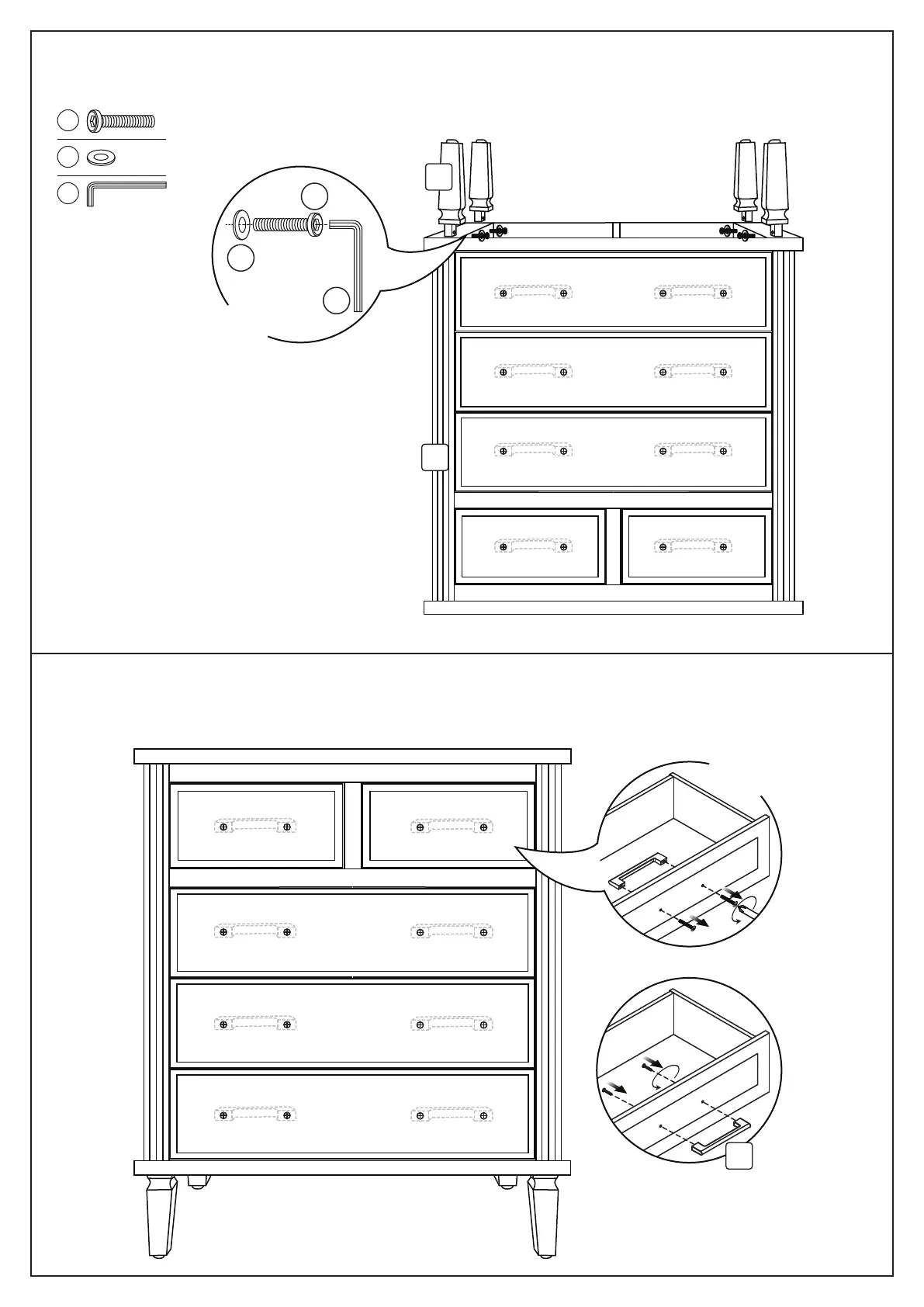DUSK Sienna - Step 1: Attaching the Legs to the Bottom of 5 Drawer Chest; Step 2: Drawer Handles Are Pre-Assembled Reversely.