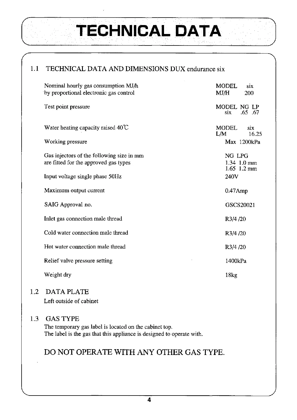 Dux Endurance six - TECHNICAL DATA OVERVIEW; TECHNICAL SPECIFICATIONS; DATA PLATE LOCATION; GAS TYPE INFORMATION