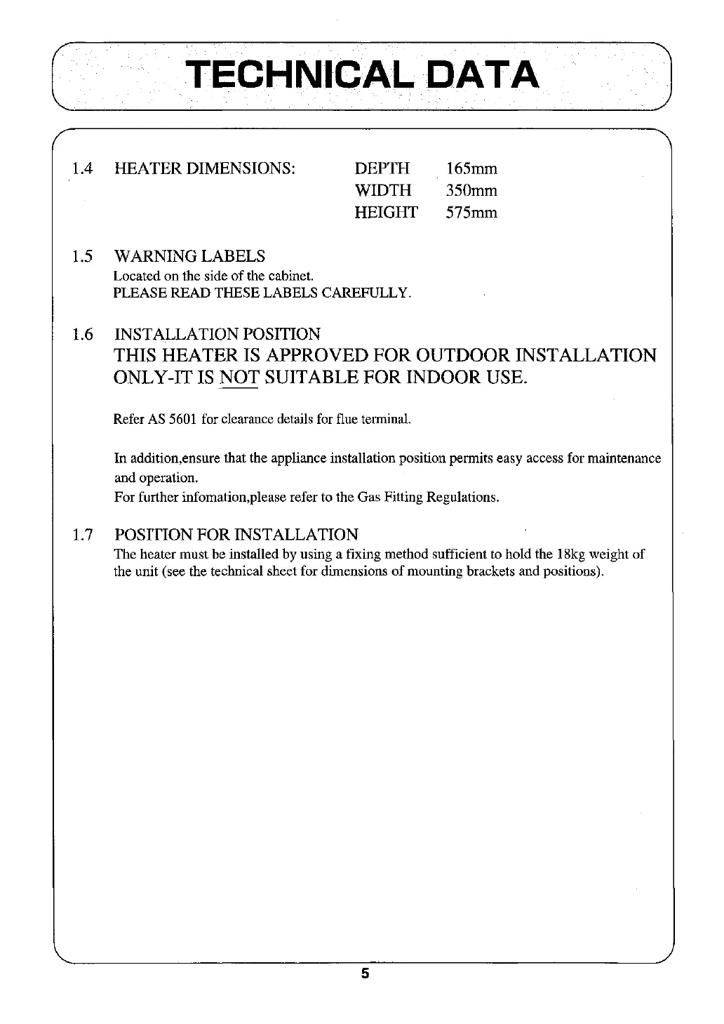 Dux Endurance six - HEATER DIMENSIONS AND INSTALLATION POSITION; HEATER DIMENSIONS; WARNING LABELS; APPROVED INSTALLATION POSITION