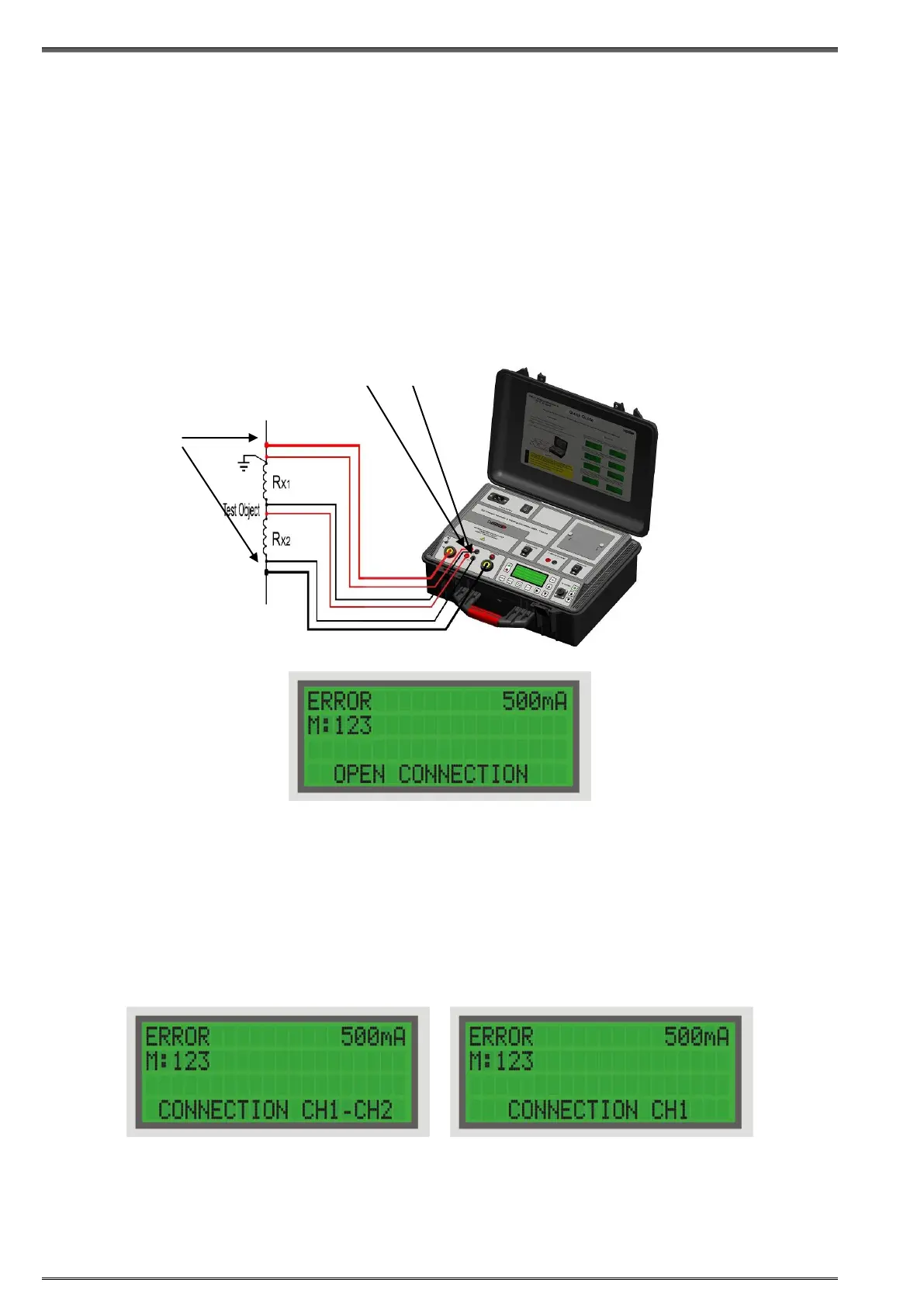 The Error message "Connection CH1-2" is displayed if both, CH1 and CH2 are not connected in the