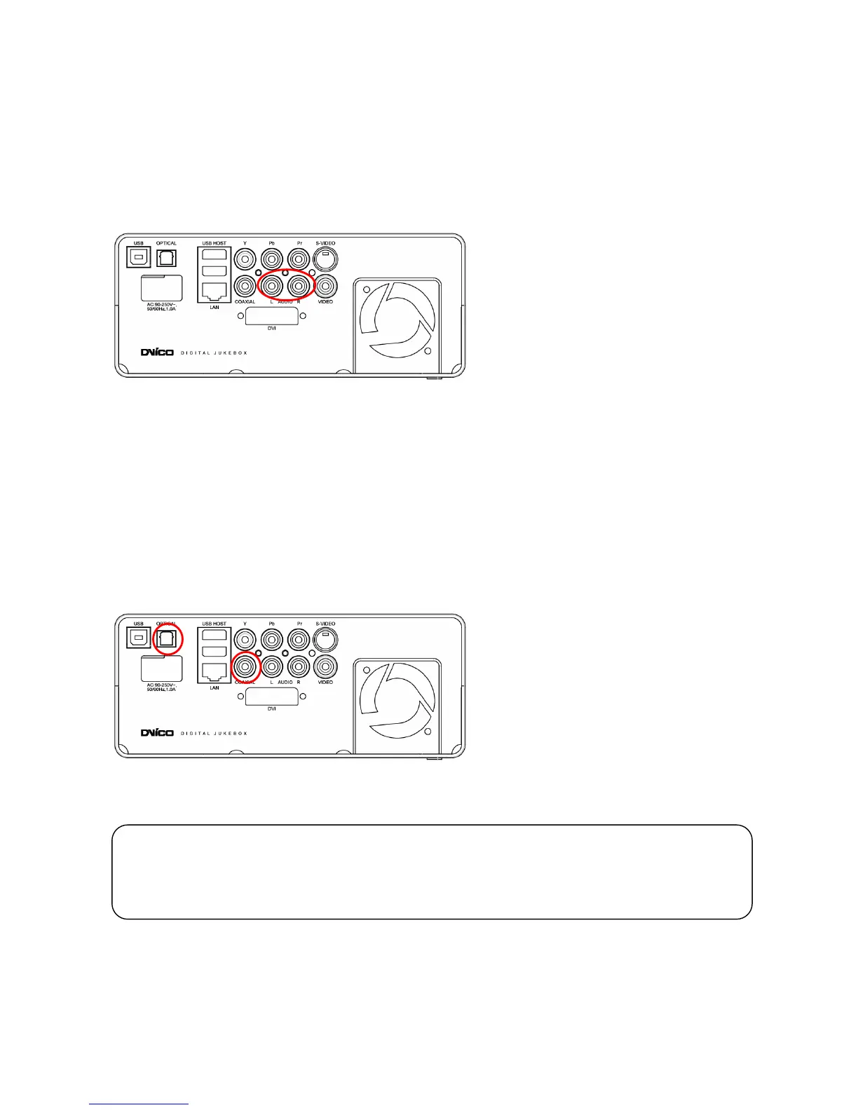 The illustration on the left shows where to connect the coaxial cable. Optical cable connection is done in a