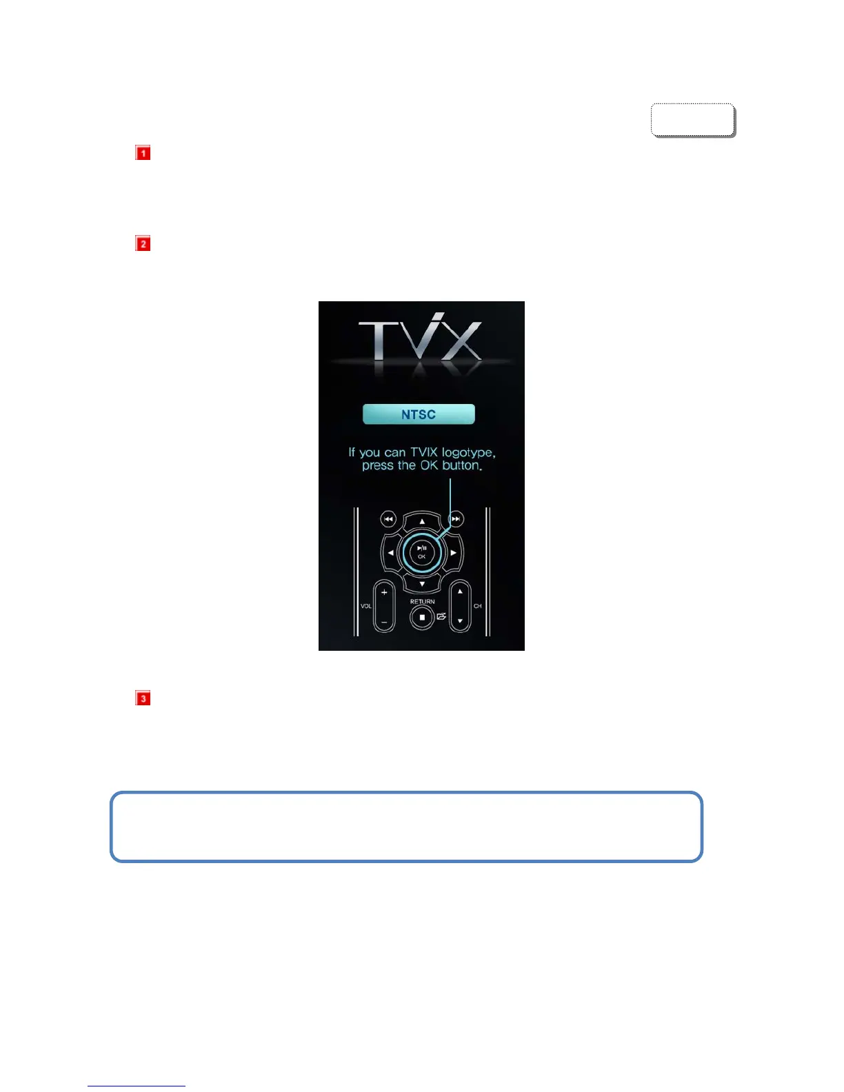 아래 그림과 같은 TViX 로고가 보이면 리모콘의 OK 버튼을 누릅니다.