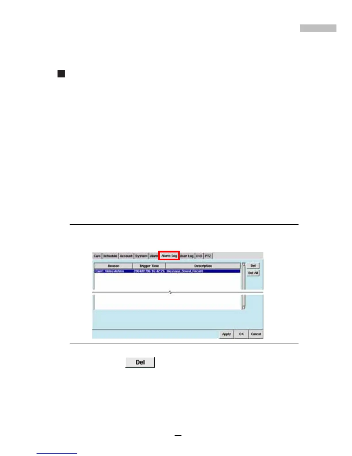 The Alarm Log provides the administrator of the DVR with a detailed log of