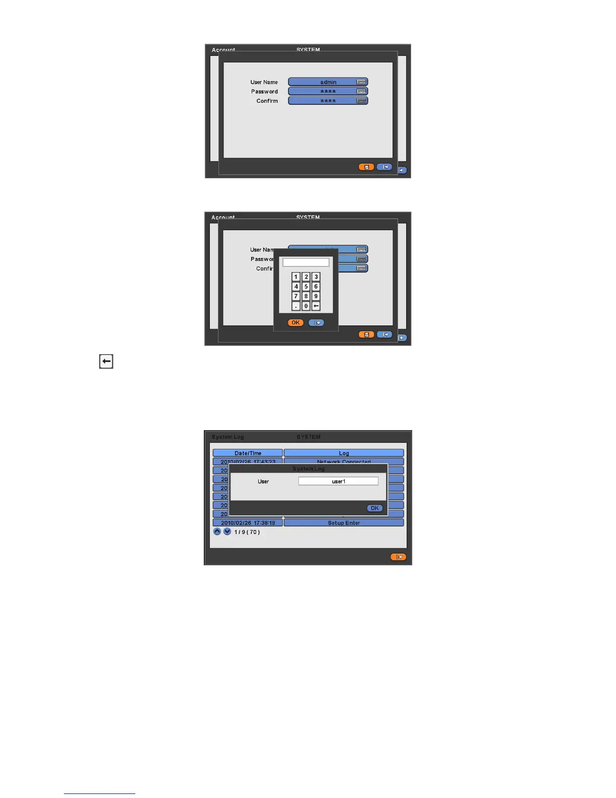 System Log displays diverse events as below events by specifying the user account who actually has accessed the DVR.