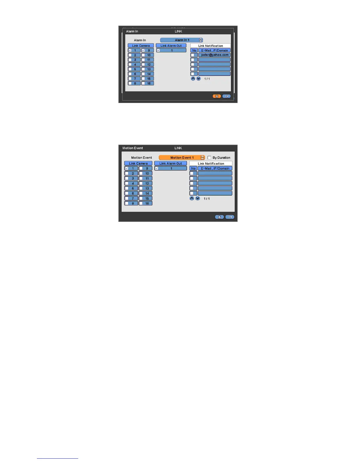② Select cameras for recording when Motion Event 1 is on. Please check a check box under Link Camera. More than