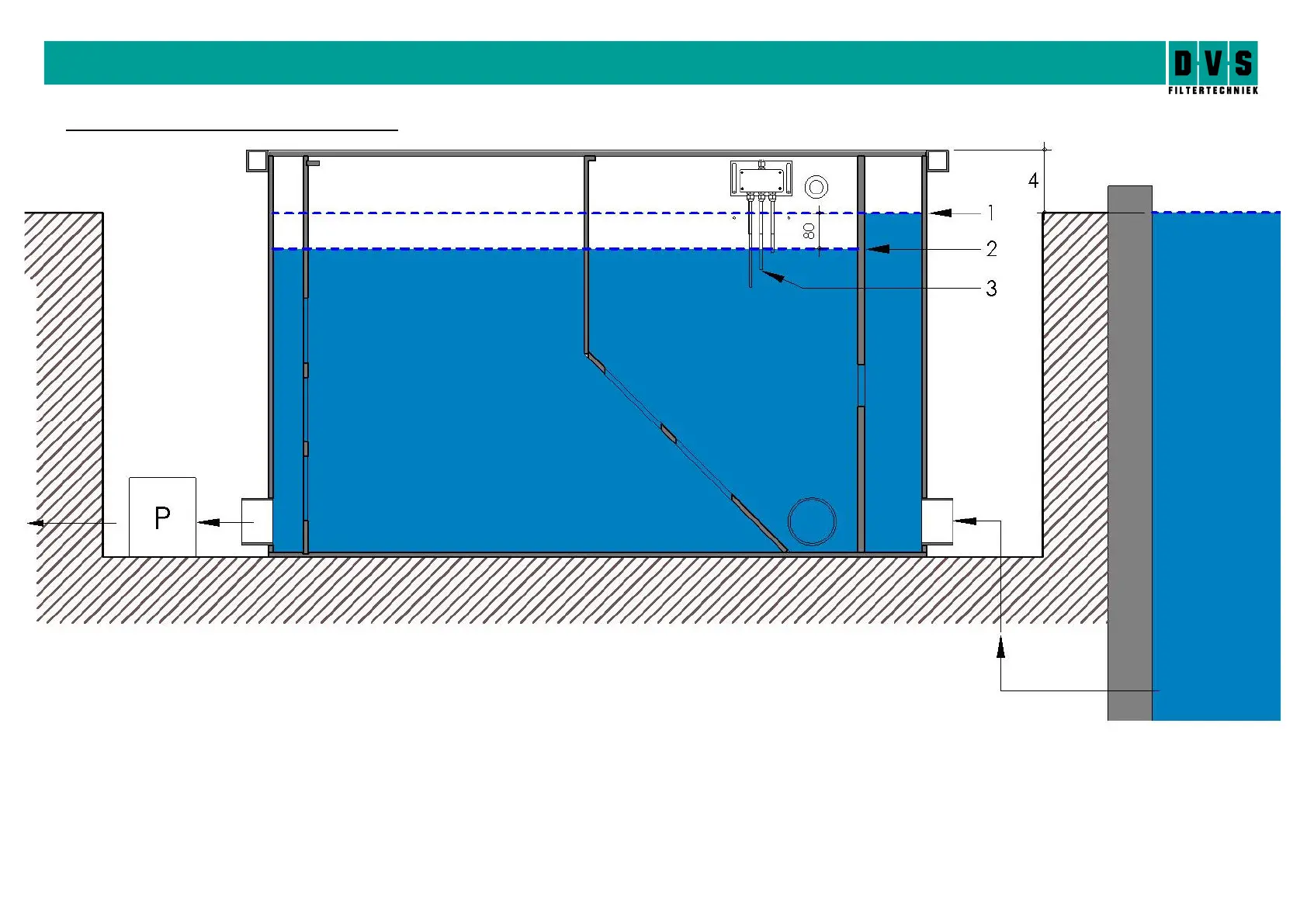 1. Water level with running pump after rinse (short pen 8 cm in water)