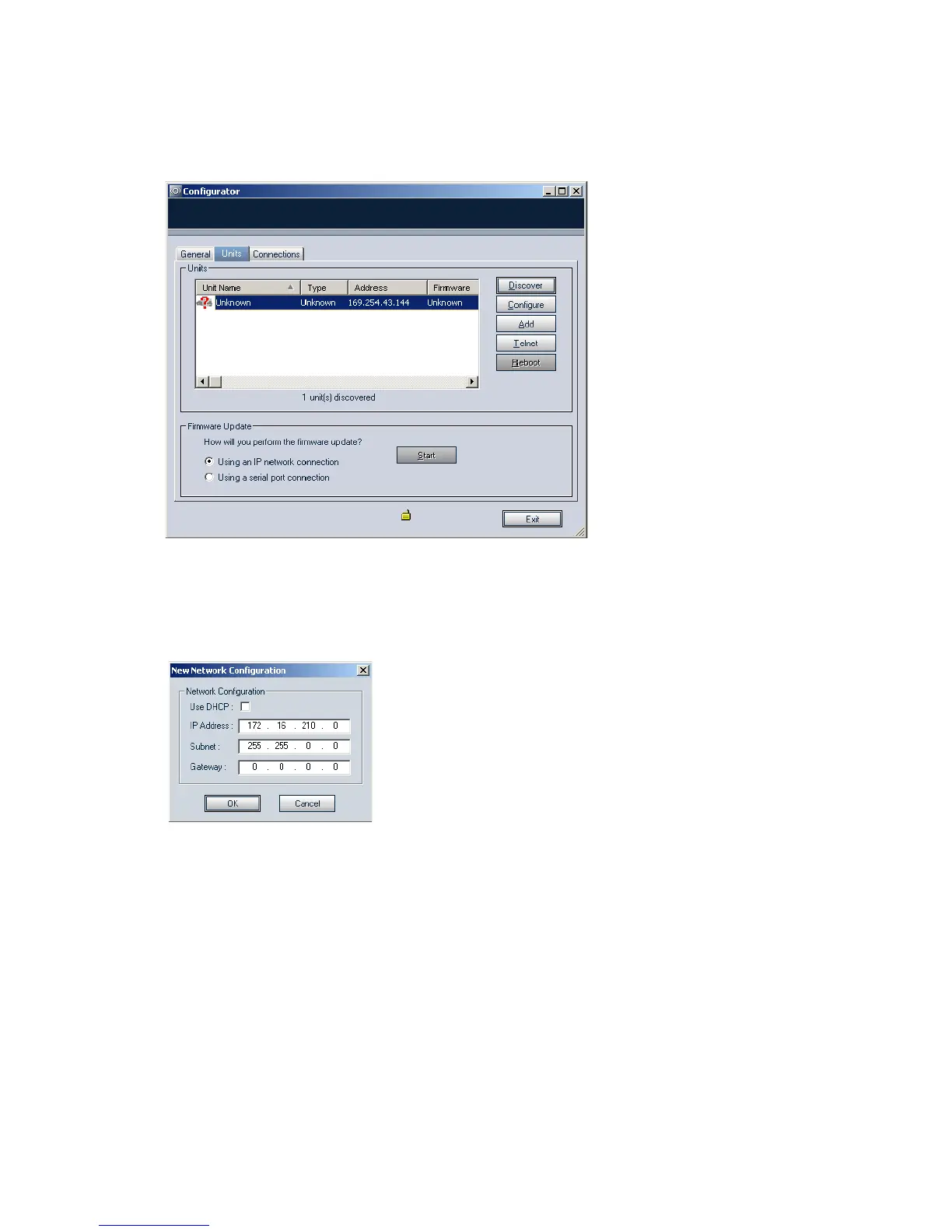 A unit of type “Unknown” with a 169.254.X.Y IP address should appear in the list;