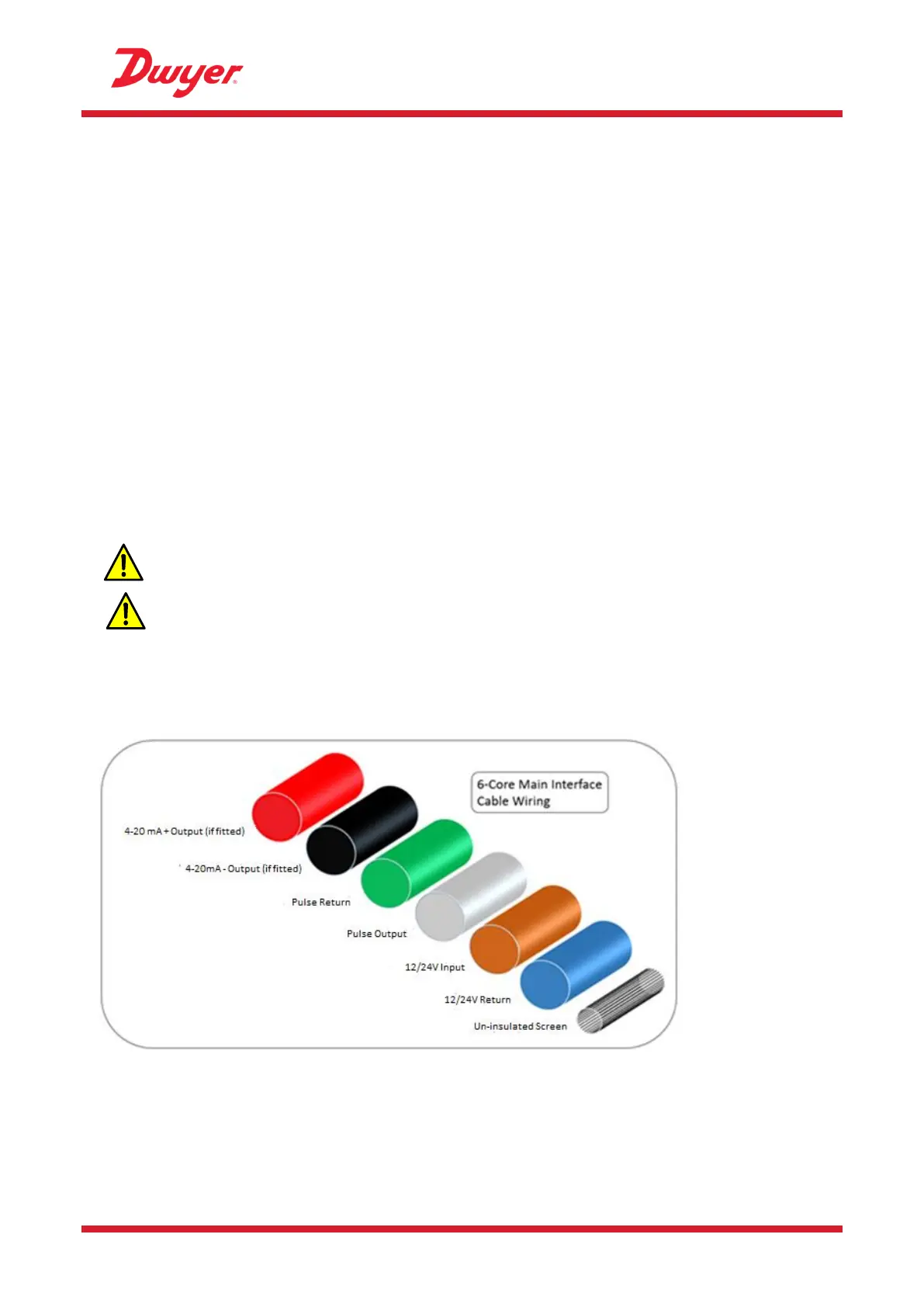 The interface cable supplied is a 6-core cable for power, pulse output and 4-20 mA (if fitted)