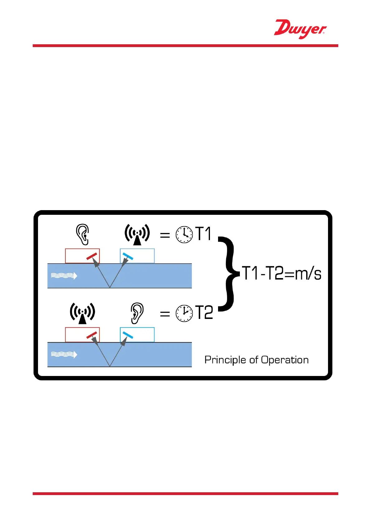 the reverse direction, being sent from the upstream transducer (red) to the downstream transducer