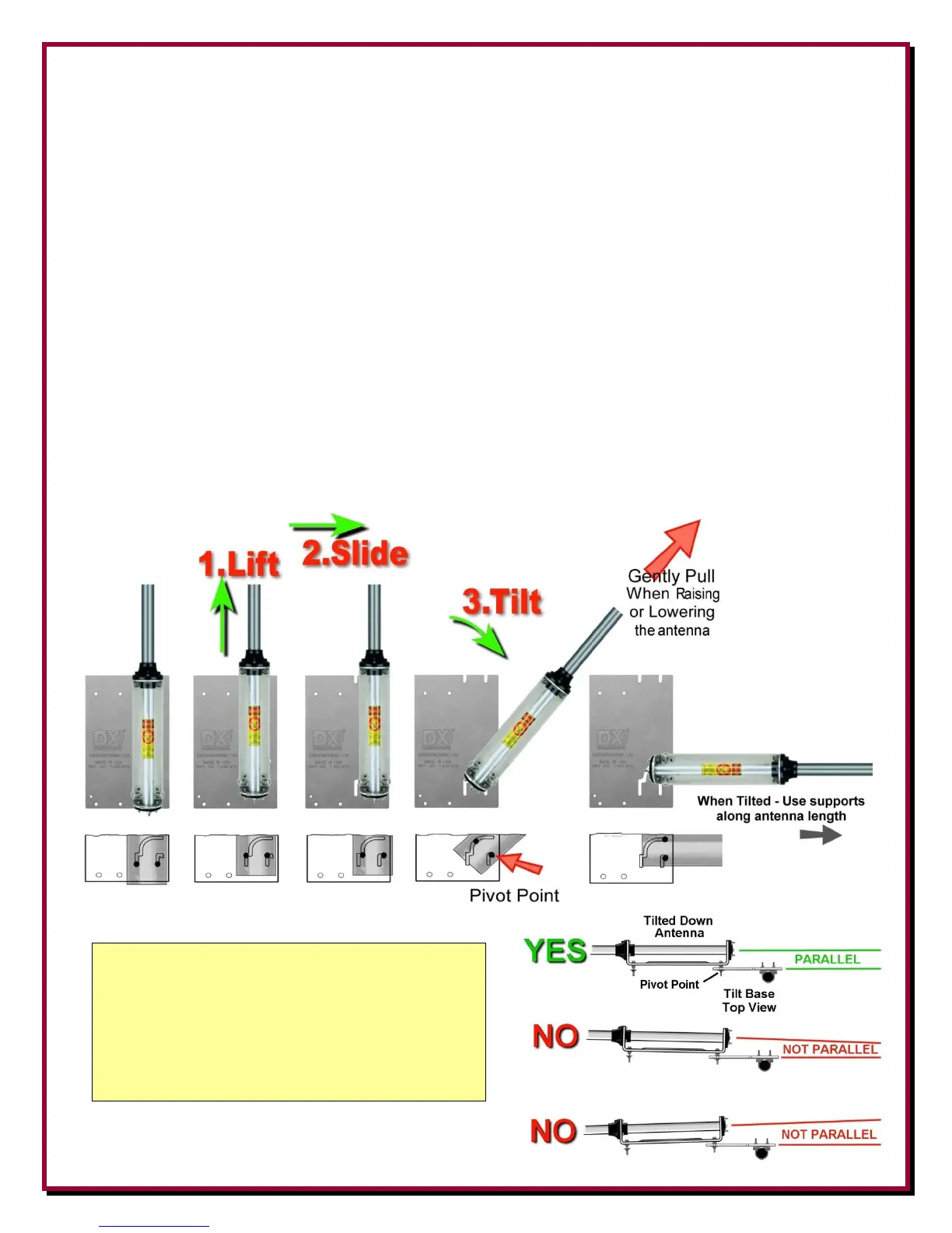 lower bolts. Keep the antenna parallel to the Tilt Base when raising or lowering to prevent the pivot