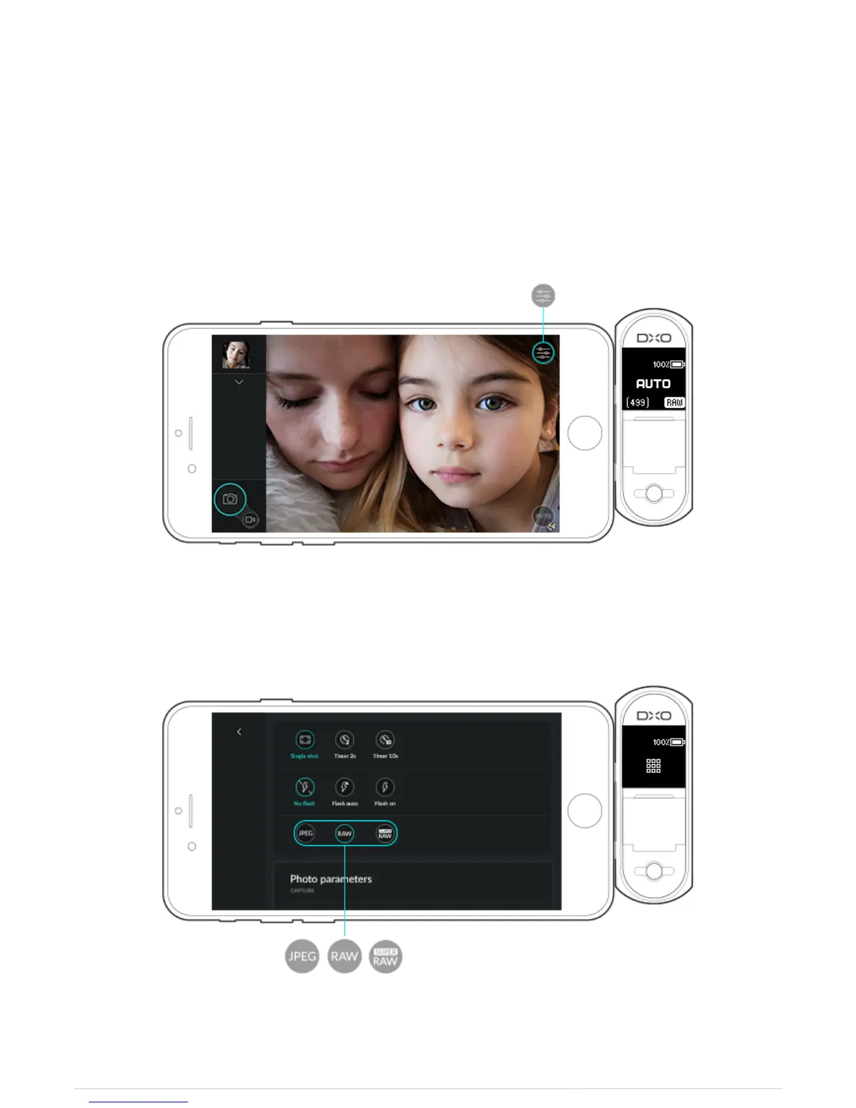 By default, the DxO ONE saves files in RAW+JPEG format. To change the file save format: