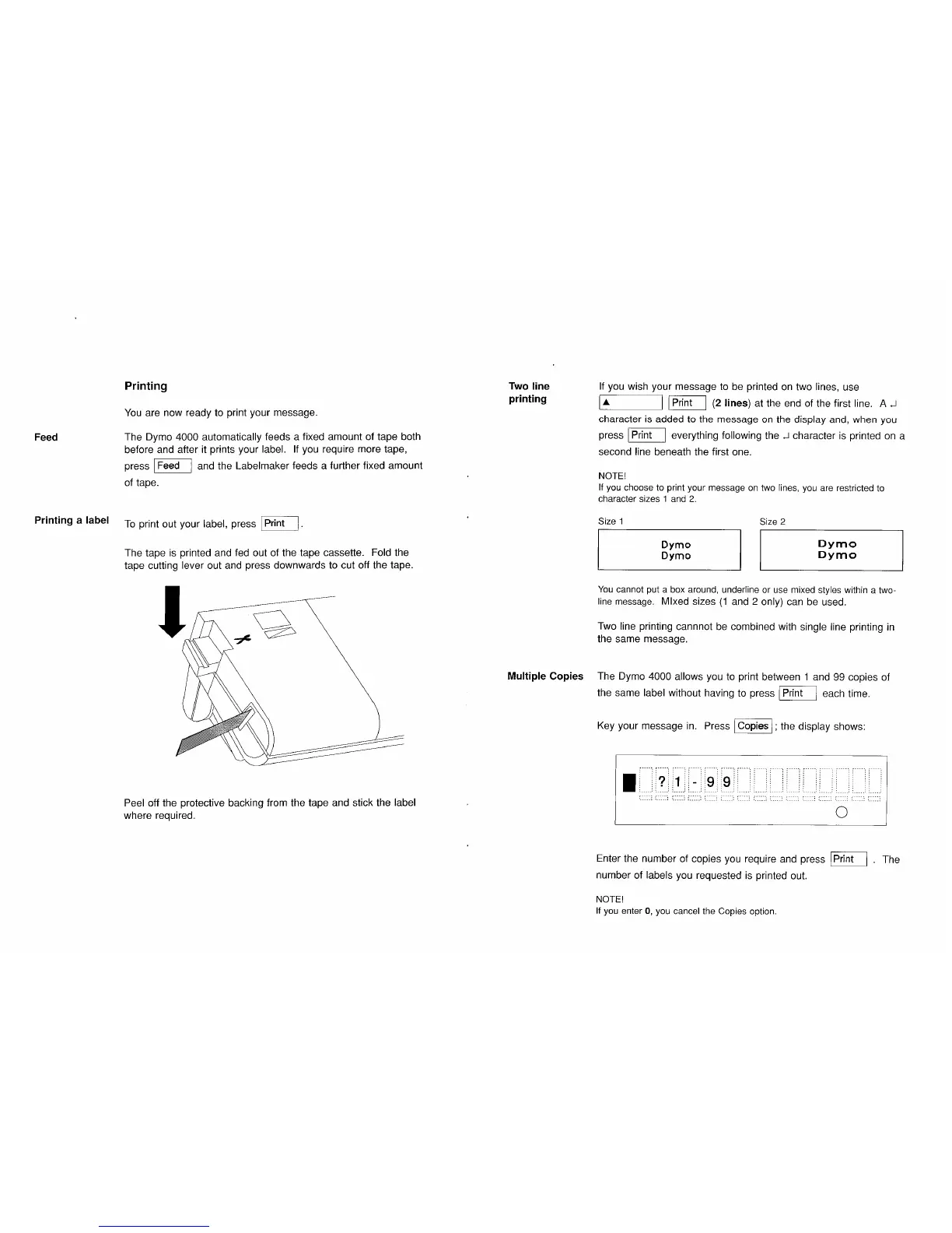 Dymo 4000 - Printing Labels; Tape Feeding and Label Printing; Two-Line Messages; Multiple Copies Printing
