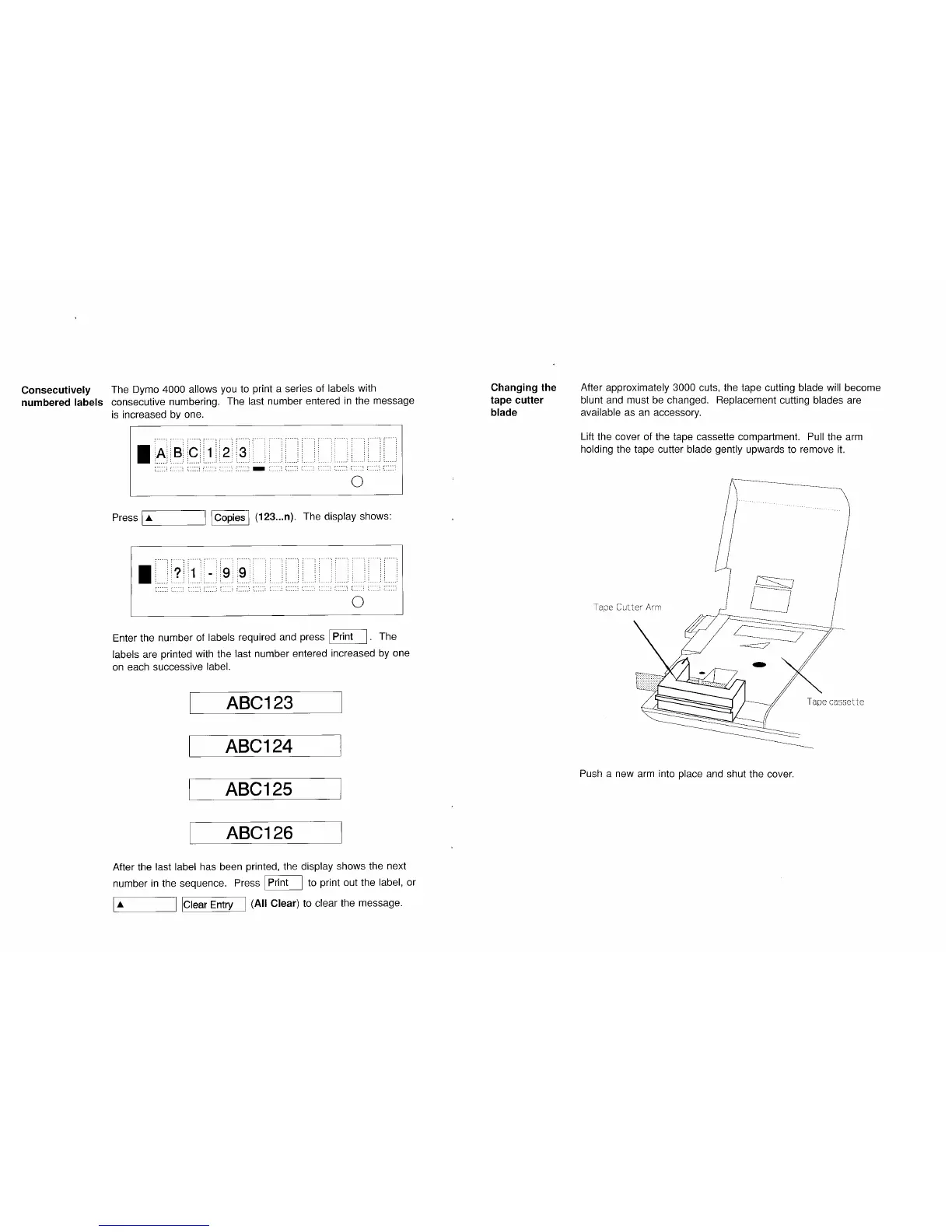Dymo 4000 - Advanced Printing Features; Consecutive Numbering; Tape Cutter Blade Replacement