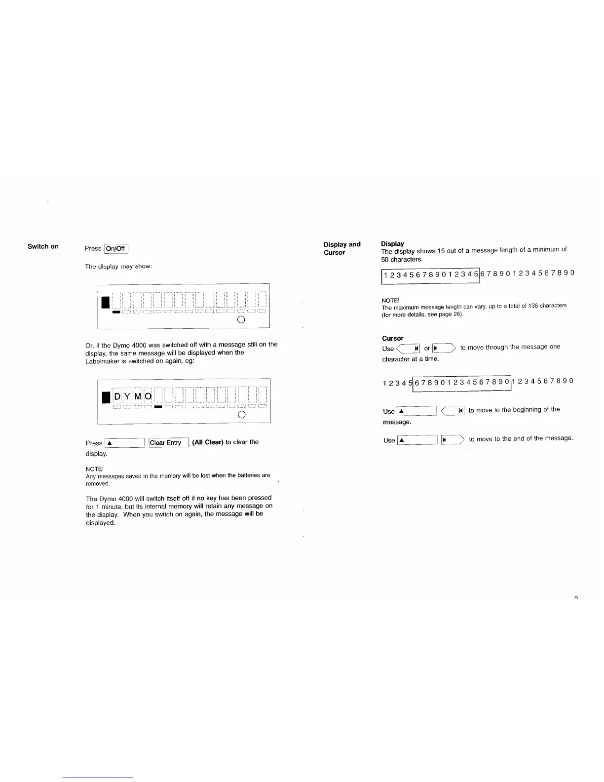 Dymo 4000 - Basic Operation; Switching On and Display Management; Cursor Navigation for Editing
