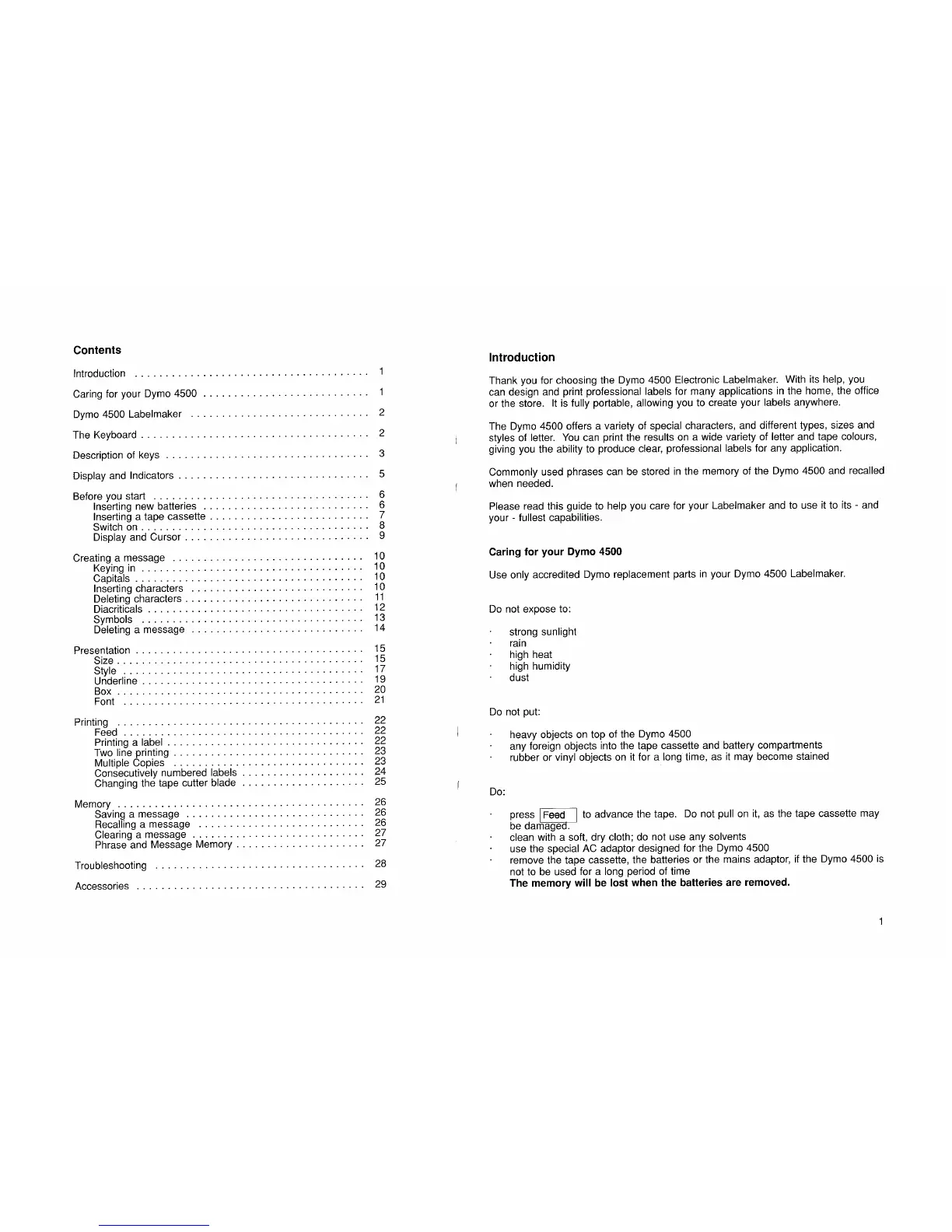 Dymo 4500 - Contents; Caring for Your Dymo 4500