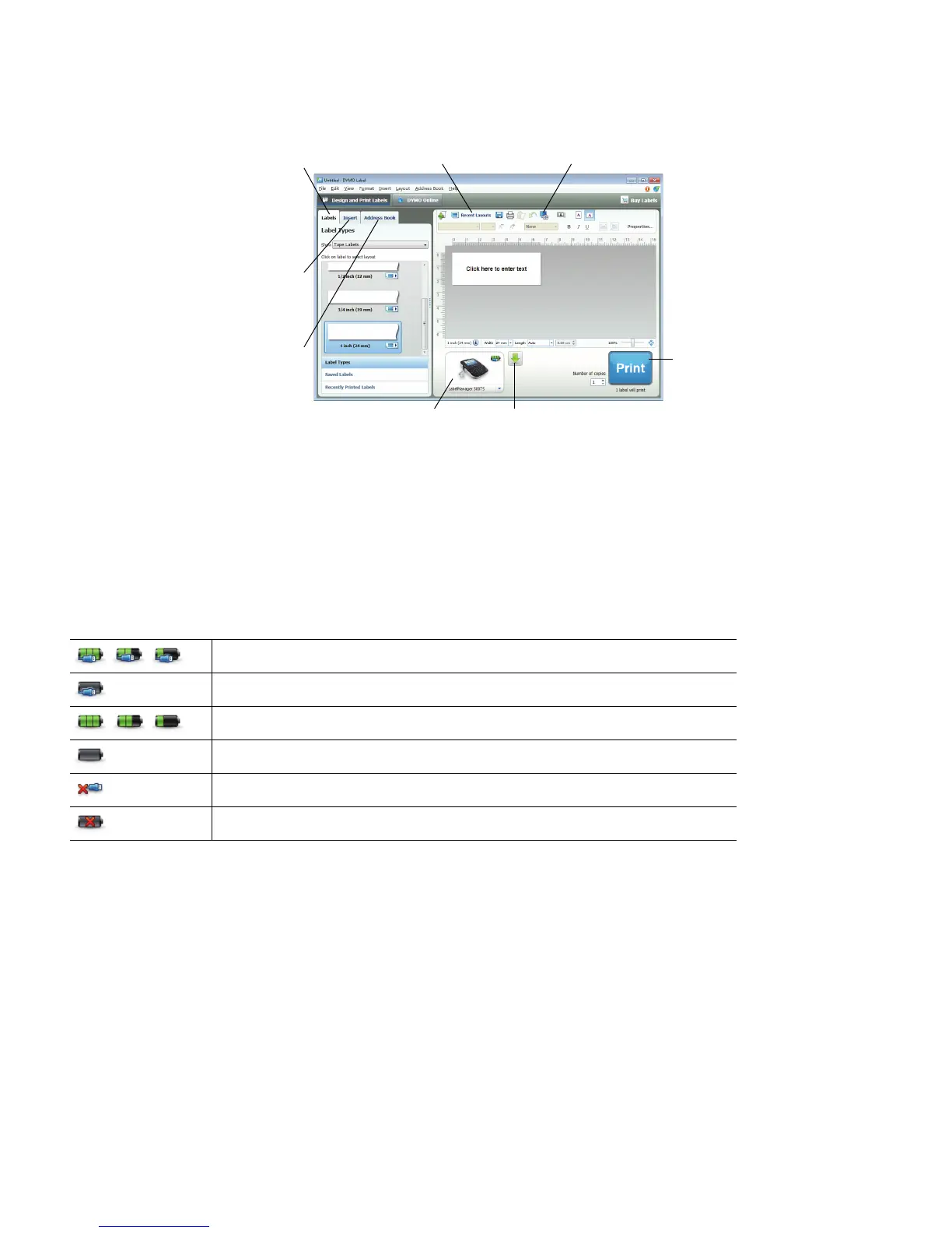 The label maker status is displayed in the DYMO Label software Print area. The following table describes the possible