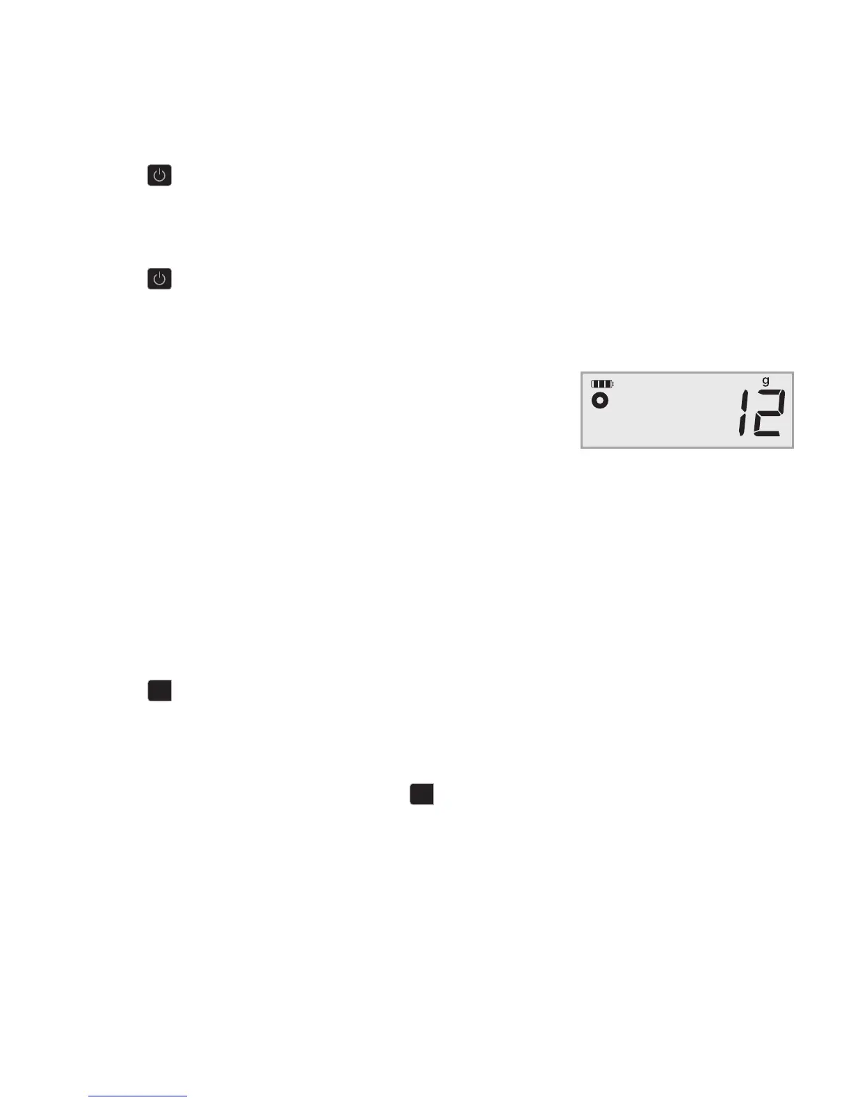 innan vägningen påbörjas. Teckenfönstret visar 0 g, 0.0 oz, eller 0.00 oz när den är redo.