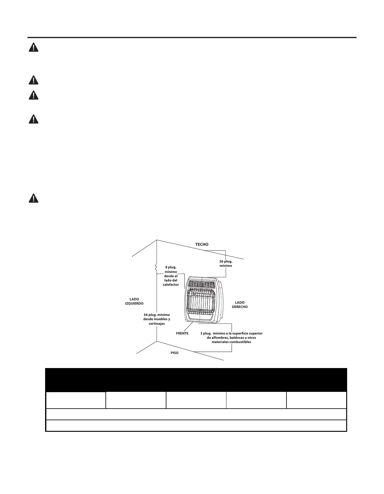 El espacio libre superior es desde la cubierta del calefactor al techo, repisa de madera u otro material combusble.