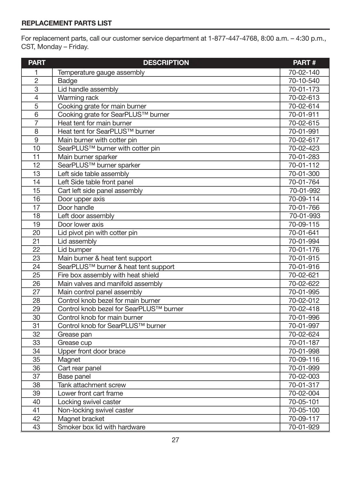 For replacement parts, call our customer service department at 1-877-447-4768, 8:00 a.m. – 4:30 p.m.,