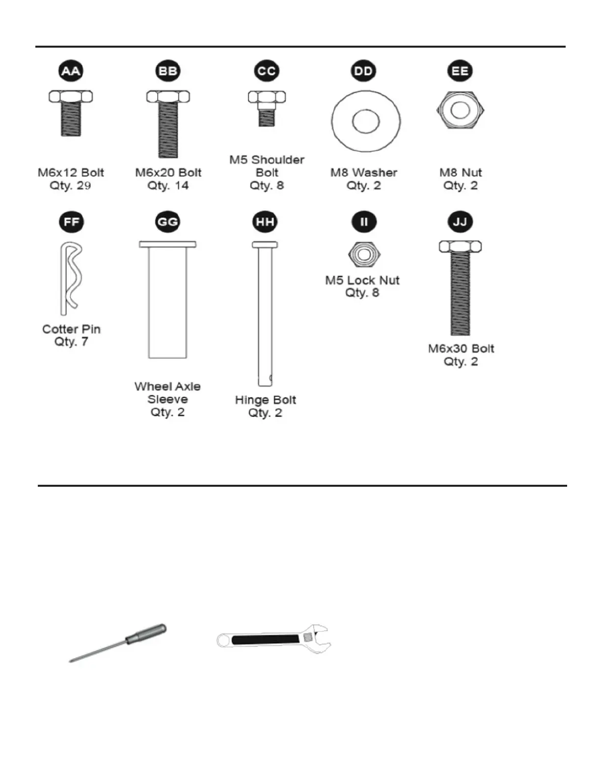 Tools Required for Assembly (not included): Phillips screwdriver, Adjustable wrench