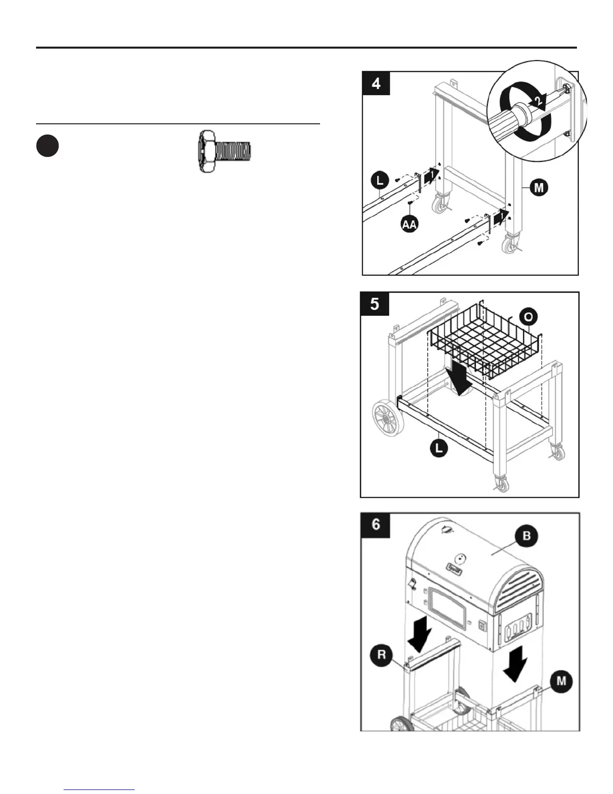 5. Attach storage basket (O) to cart braces (L).