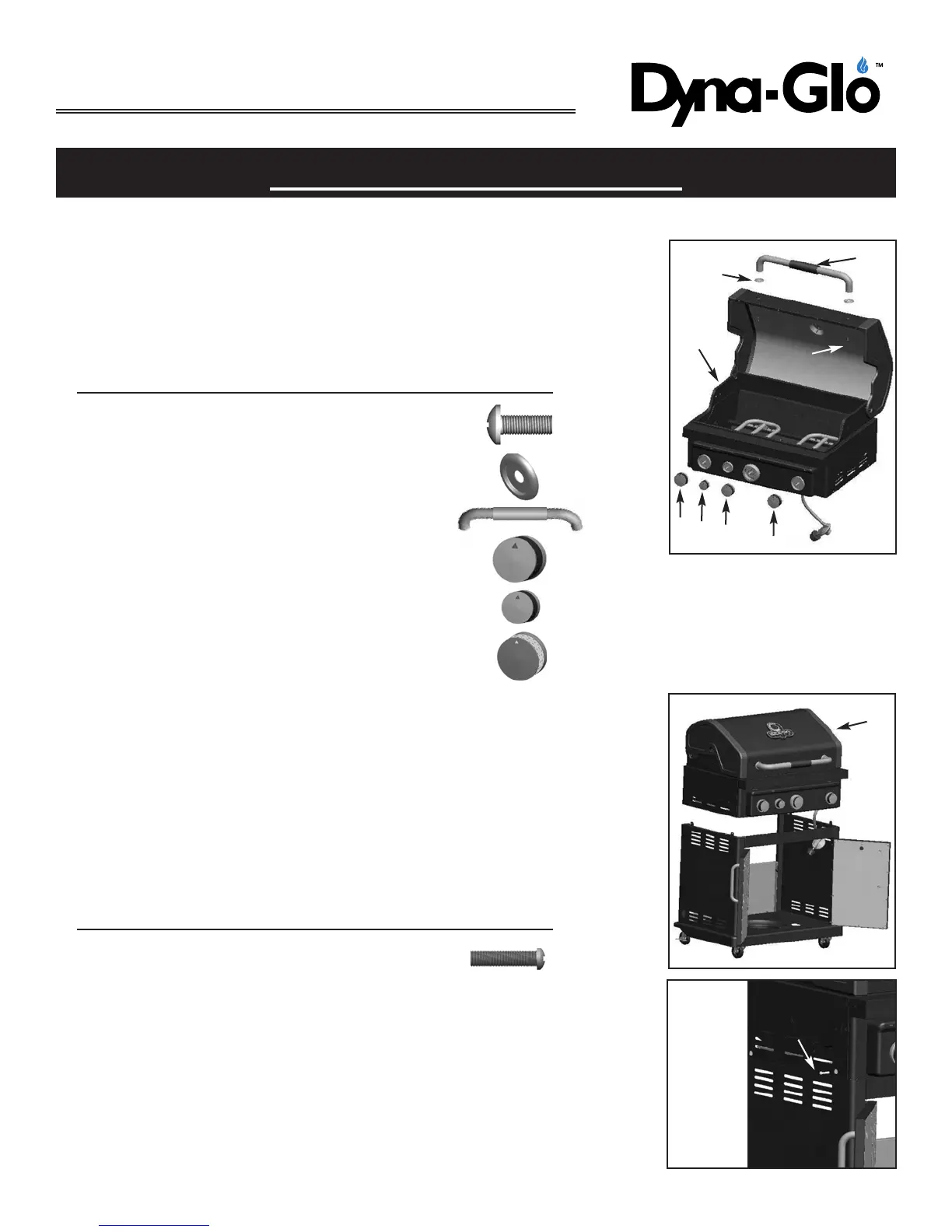 LPG hose is inside the cart. Align the holes in the grill body with