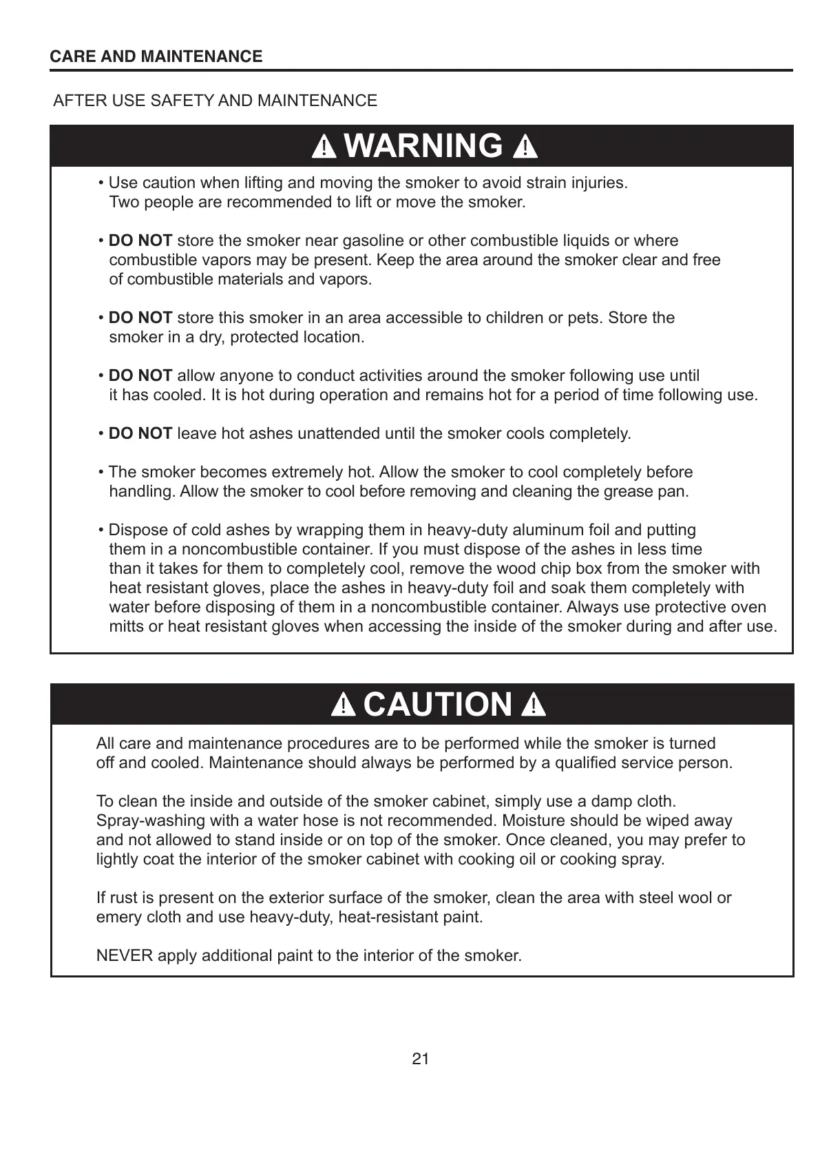 • The smoker becomes extremely hot. Allow the smoker to cool completely before