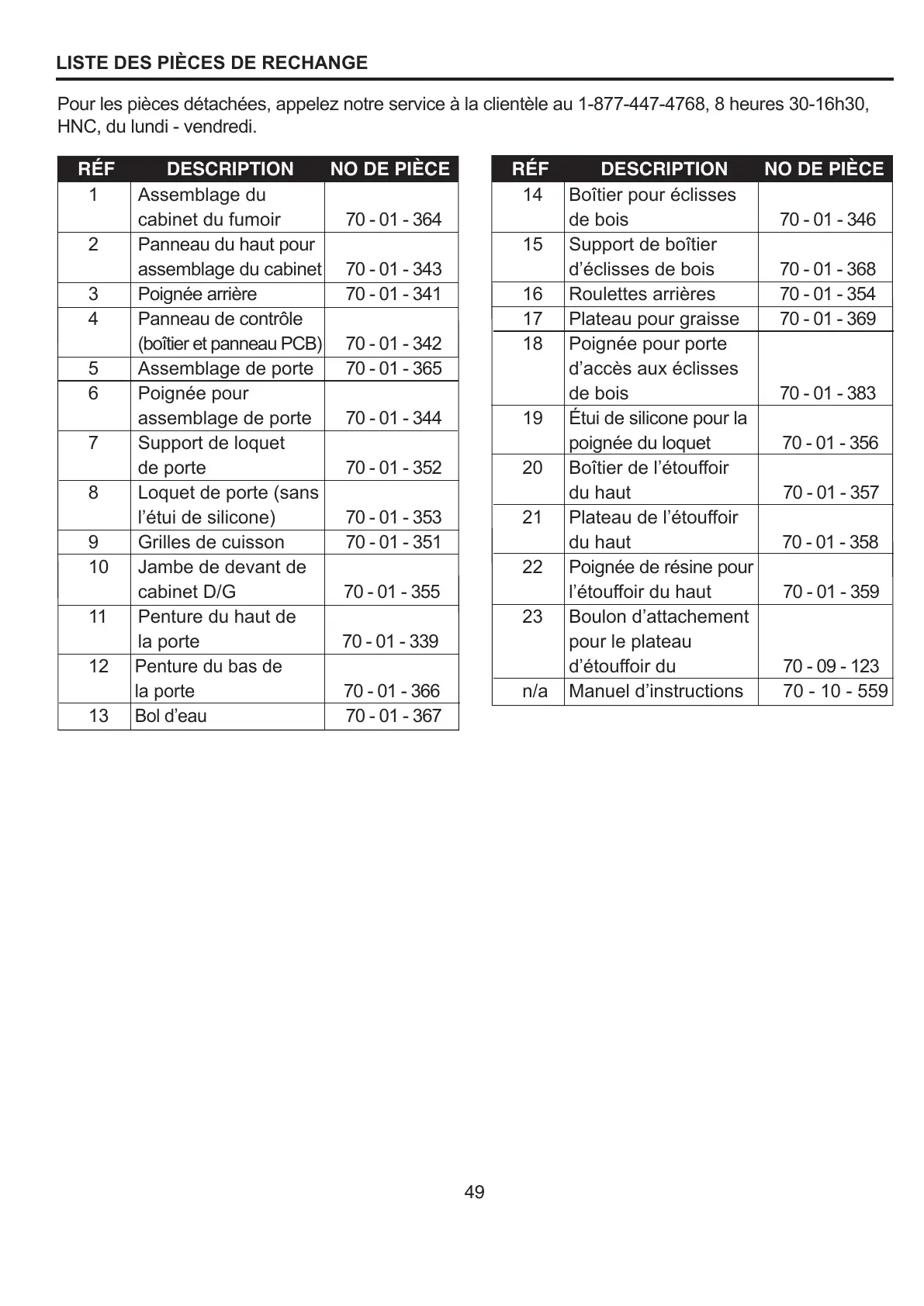 Pour les pièces détachées, appelez notre service à la clientèle au 1-877-447-4768, 8 heures 30-16h30,