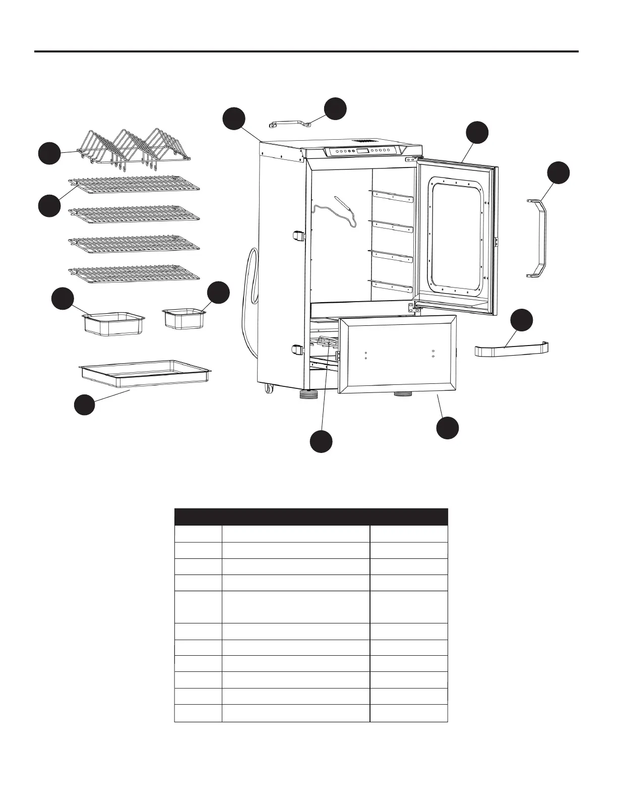 Dyna-Glo DGU732SDE-D - Package Contents; Smoker Cabinet Assembly; Doors and Handles; Cooking Accessories