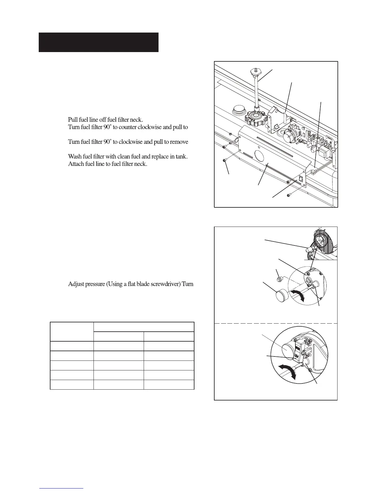 Dyna-Glo KFA80DGD - Fuel Filter and Pump Pressure; Fuel Filter Maintenance; Pump Pressure Adjustment