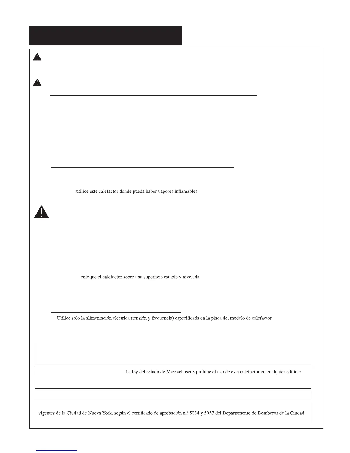 que se utilice total o parcialmente para vivienda. El uso de este dispositivo de calefacción en Massachusetts requiere el permiso del