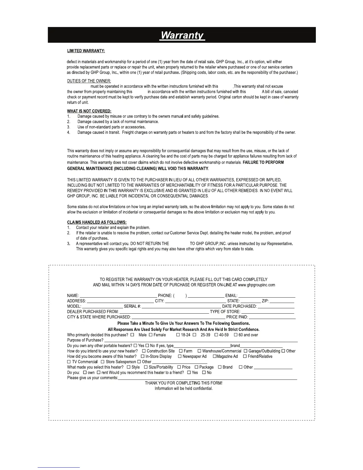 Dyna-Glo WHF100 - Warranty Information