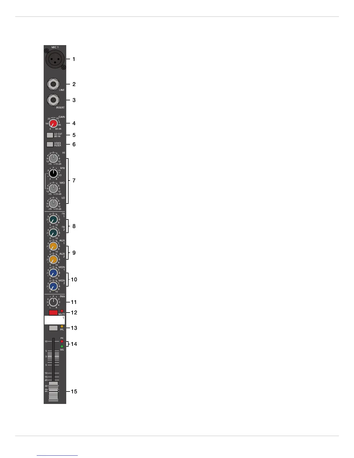 AUX- und MON-Sends stumm. PFL und Signal/Peak funktionieren weiterhin.