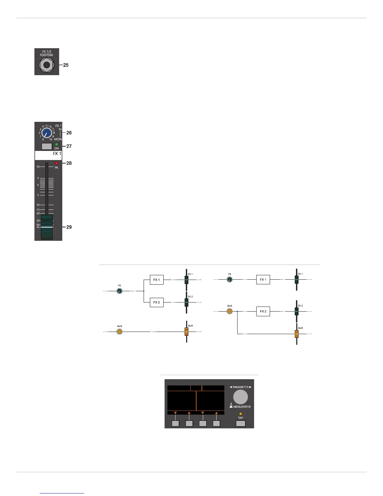 Um die beiden Effektteile FX 1 und FX 2 unabhängig verwenden zu können, kann der AUX-Weg des