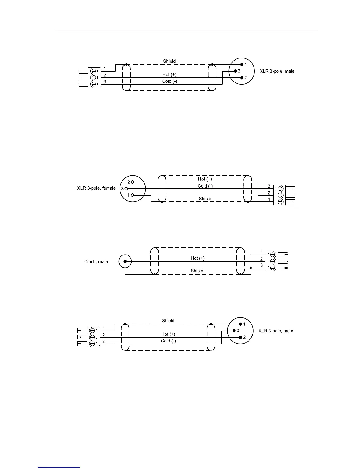 It is advisable to choose balanced cables (2 signal conductors + shield) with XLR connectors as