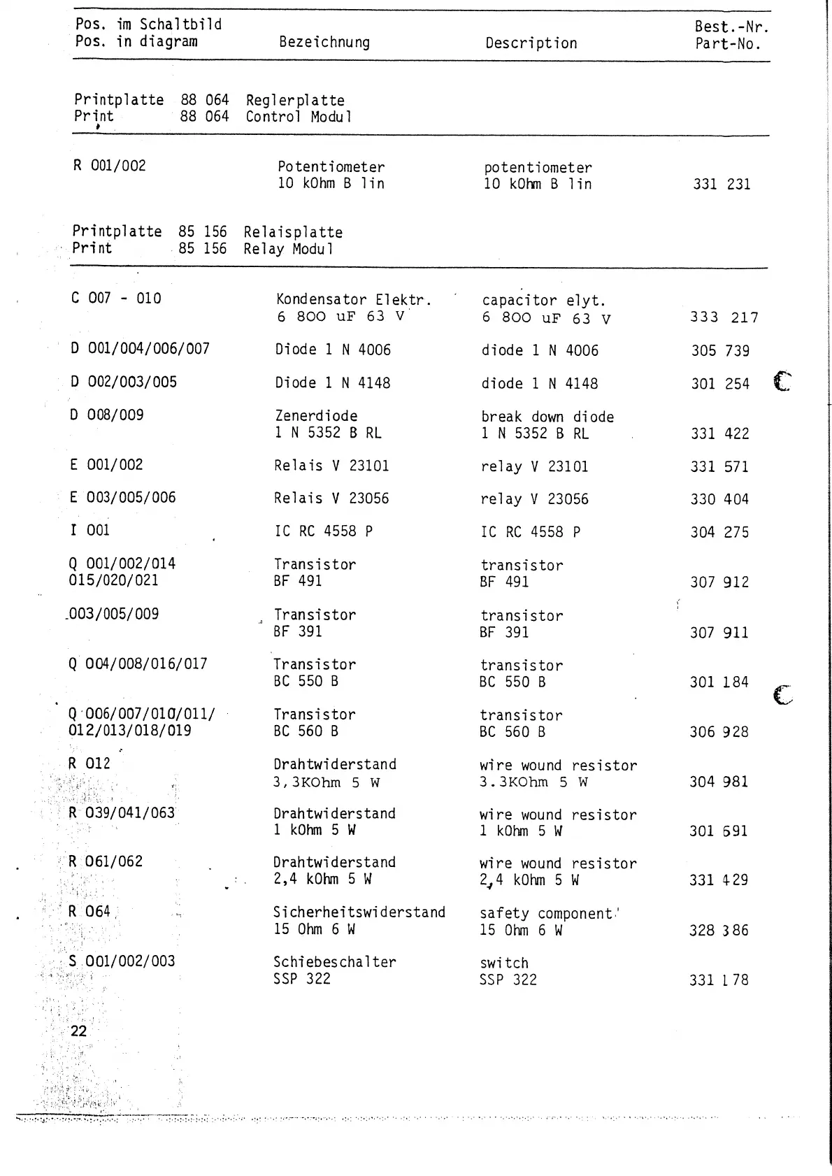 Dynacord PAA 460 - Spare Parts List (Continued); Potentiometers and Capacitors; Diodes and Relays; ICs, Transistors, and Resistors