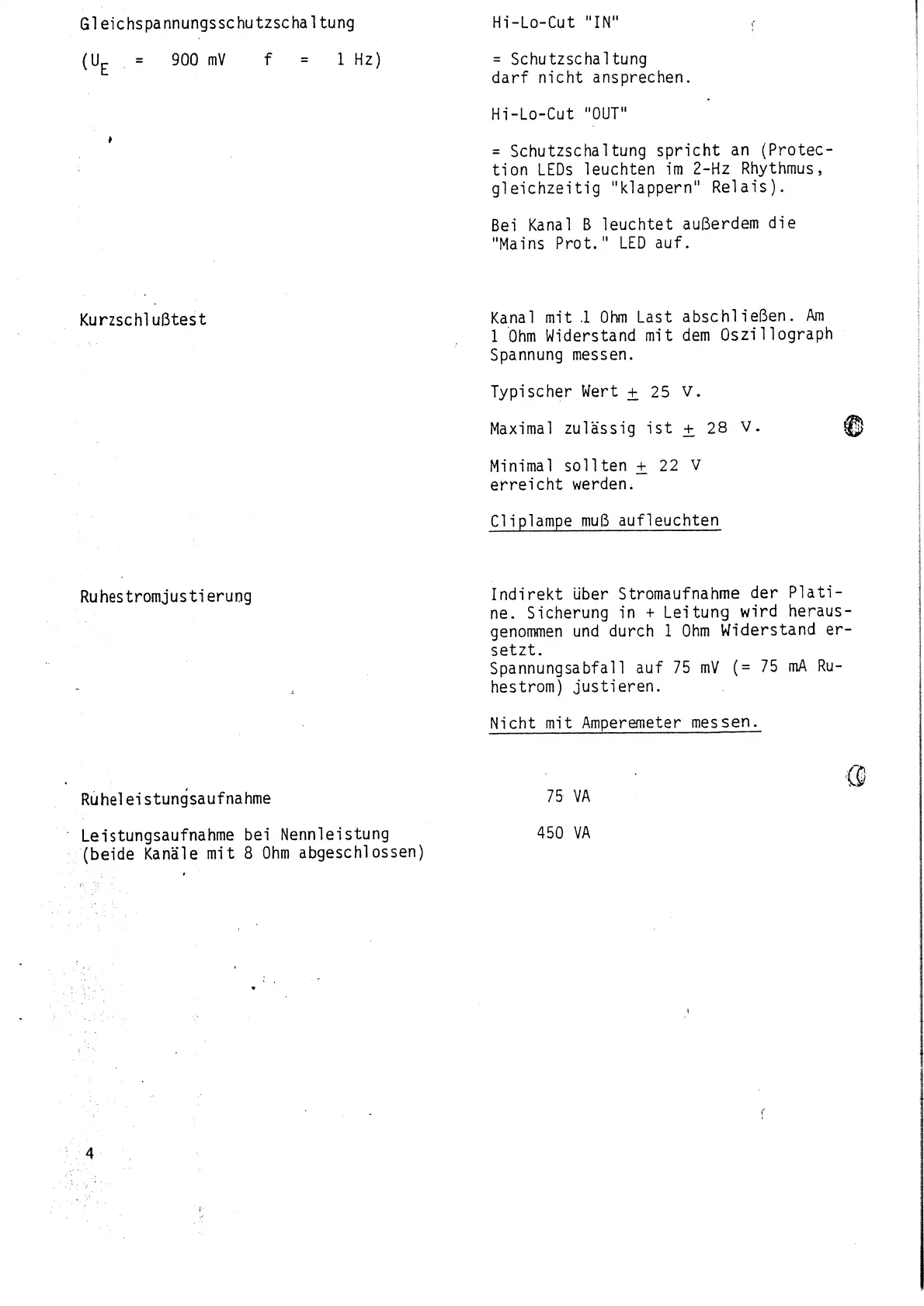 Dynacord PAA 460 - Circuit Protection and Adjustment; DC Protection Circuit Function; Short Circuit Test Procedure; Idle Current Adjustment Method