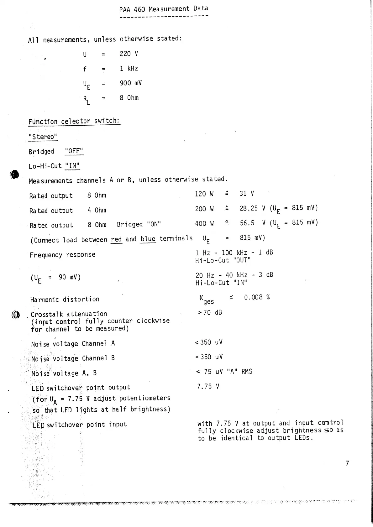 Dynacord PAA 460 - Measurement Data (English); Input Signal and Load Conditions; Function Selector Switch Settings; Rated Output Power Measurements