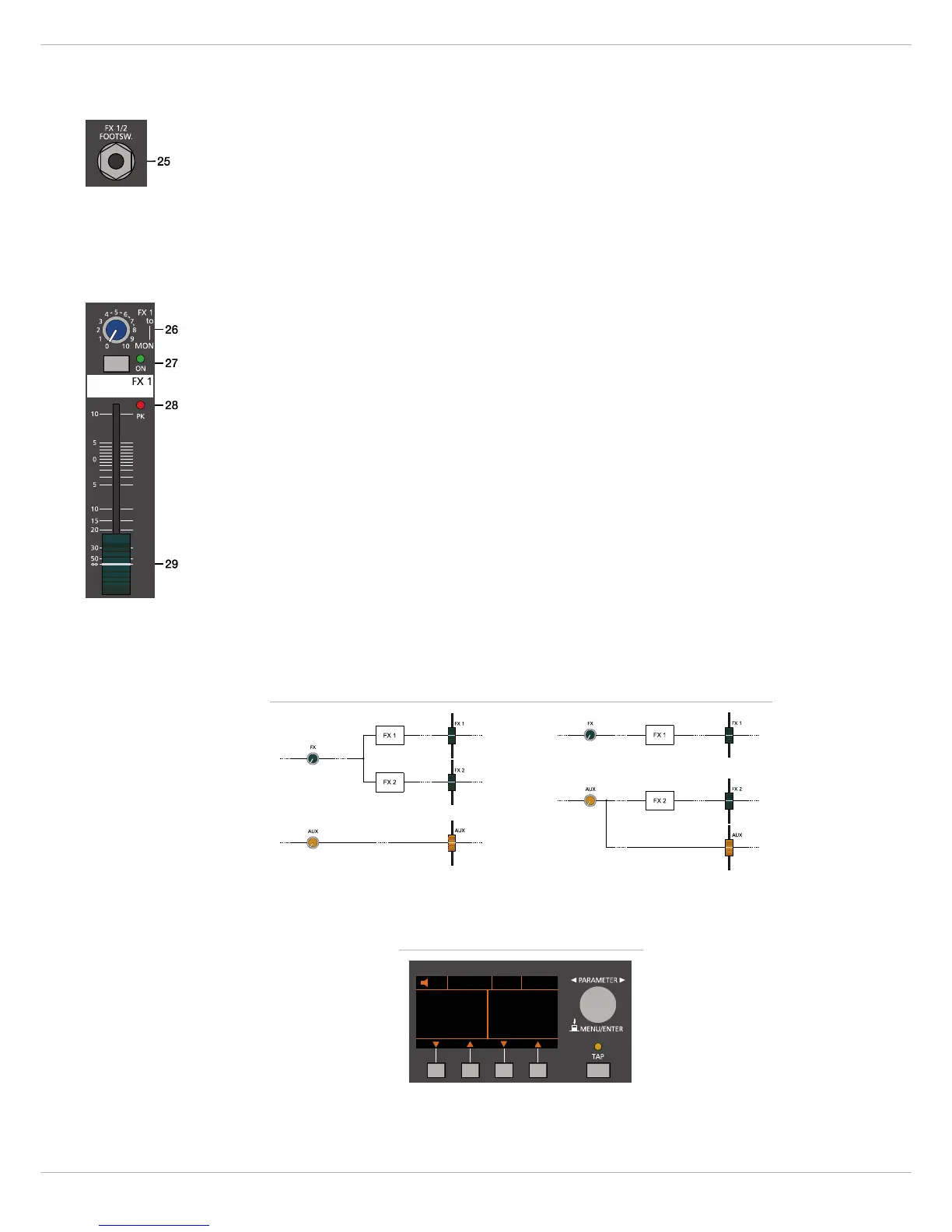 the FX controls and the signal flow to the effect units changes, see illustration 2-8. The AUX to FX 2