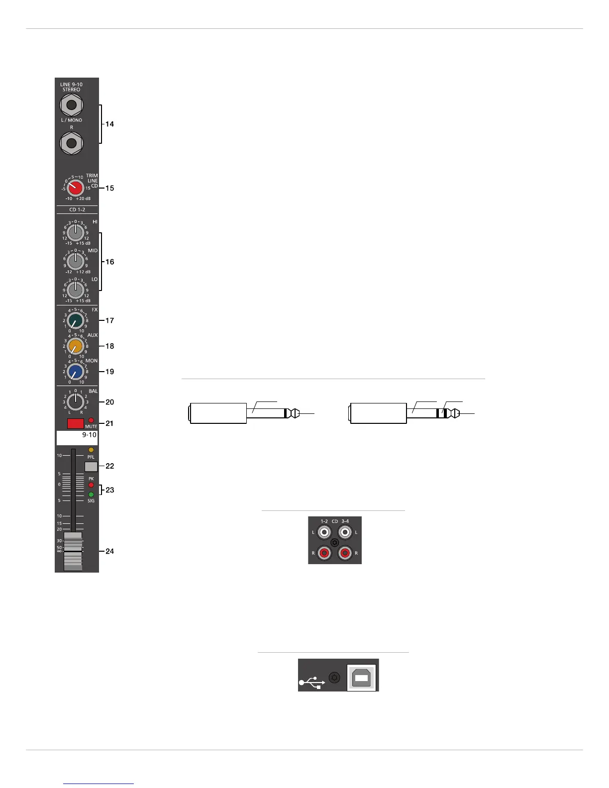 Viele Funktionsgruppen wie AUX-Regler, MON-Regler und Fader sind im Stereo-Eingang identisch zum