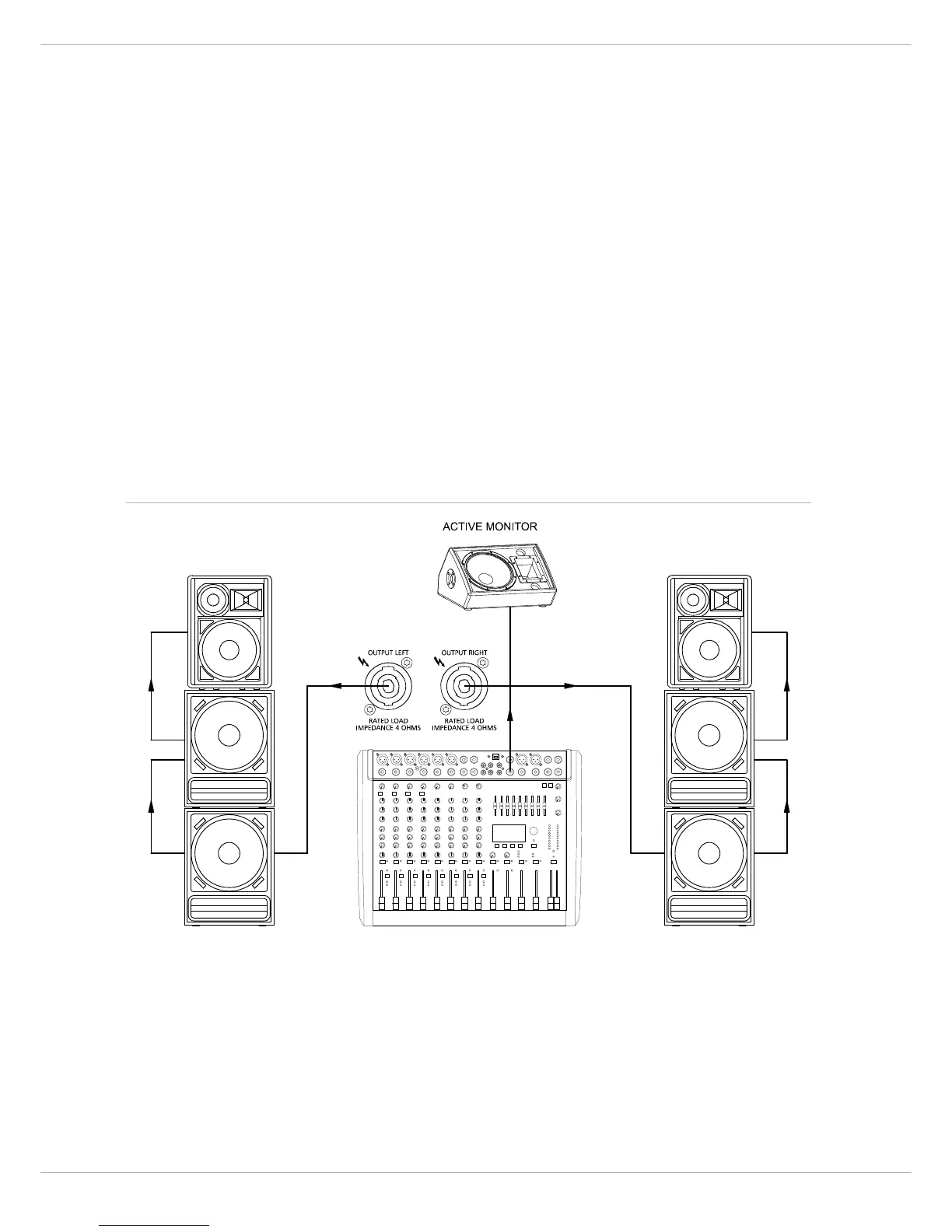 OUT L/R, MONITOR, POWER AMP INPUTS sowie der AUX SEND frei zugänglich und untereinander sowie mit externen
