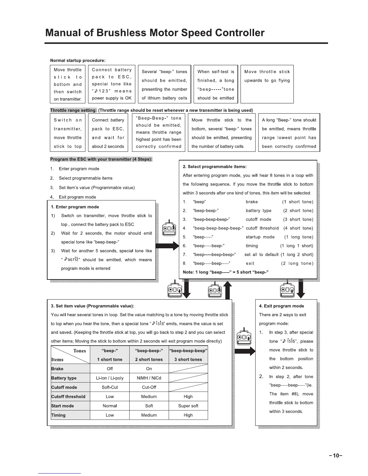 Dynam F4U Corsair - Brushless Motor Speed Controller Manual (3;3); ESC Normal Startup Procedure; ESC Throttle Range Setting; ESC Programming Steps