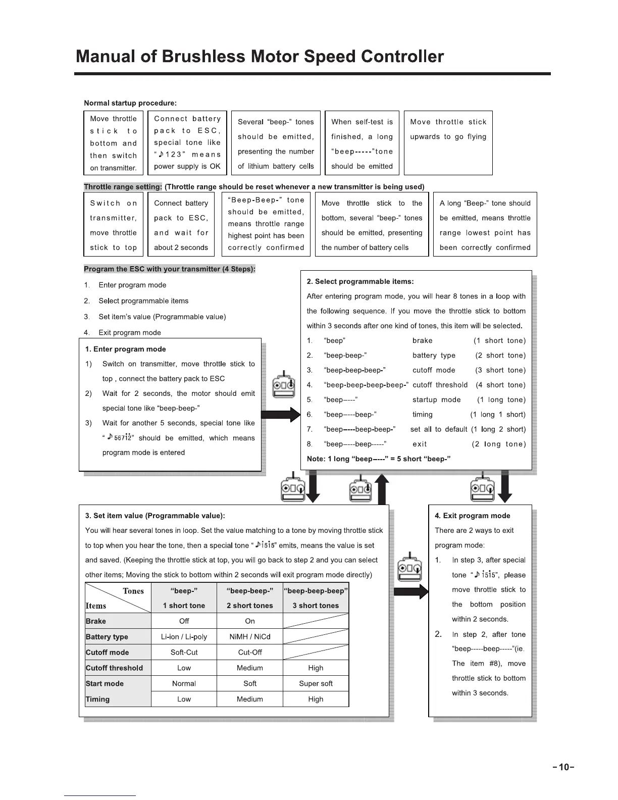 Dynam ME-262 - ESC Normal Startup and Throttle Range; ESC Programmable Items List