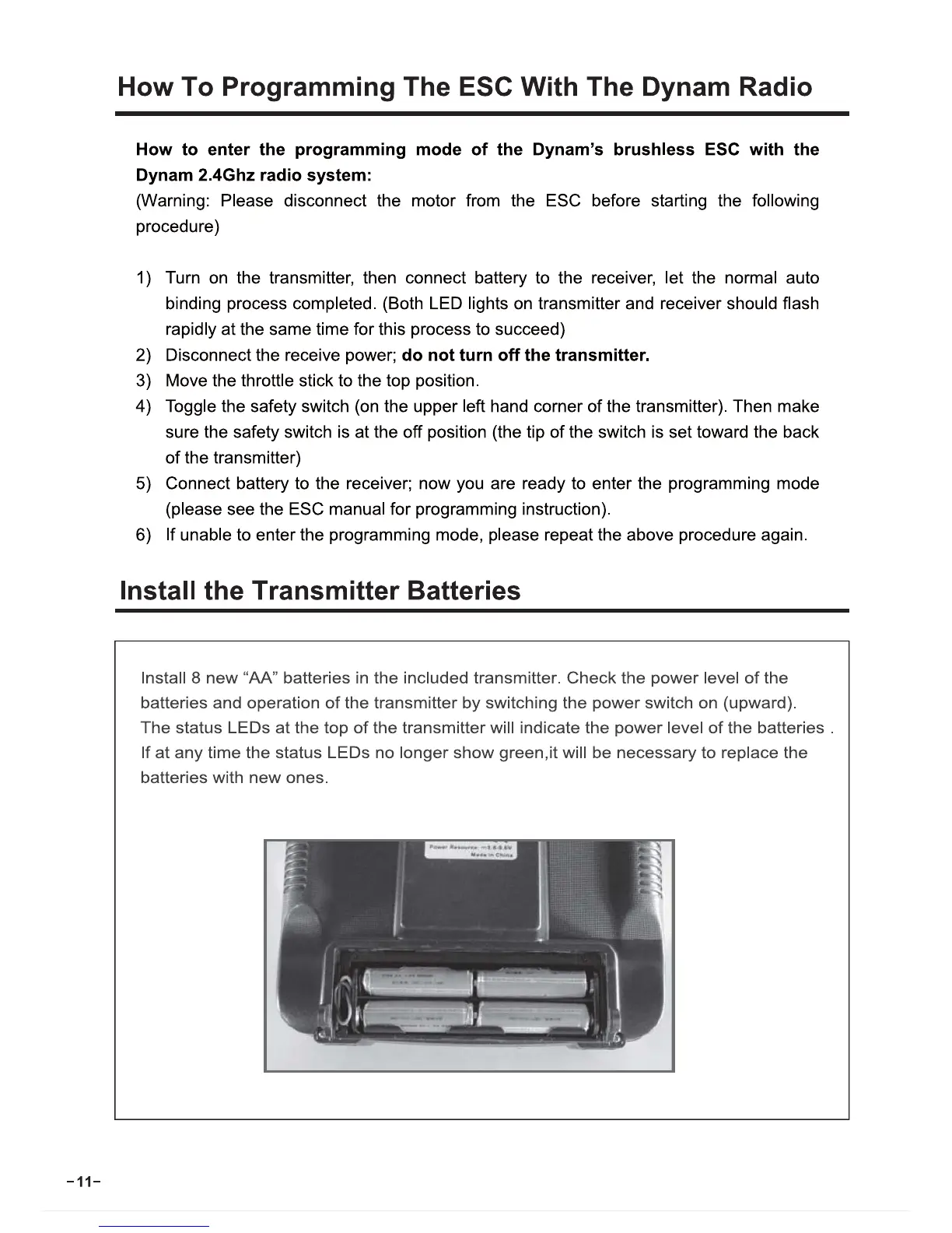 Dynam ME-262 - Programming ESC with Dynam Radio; Transmitter Battery Installation